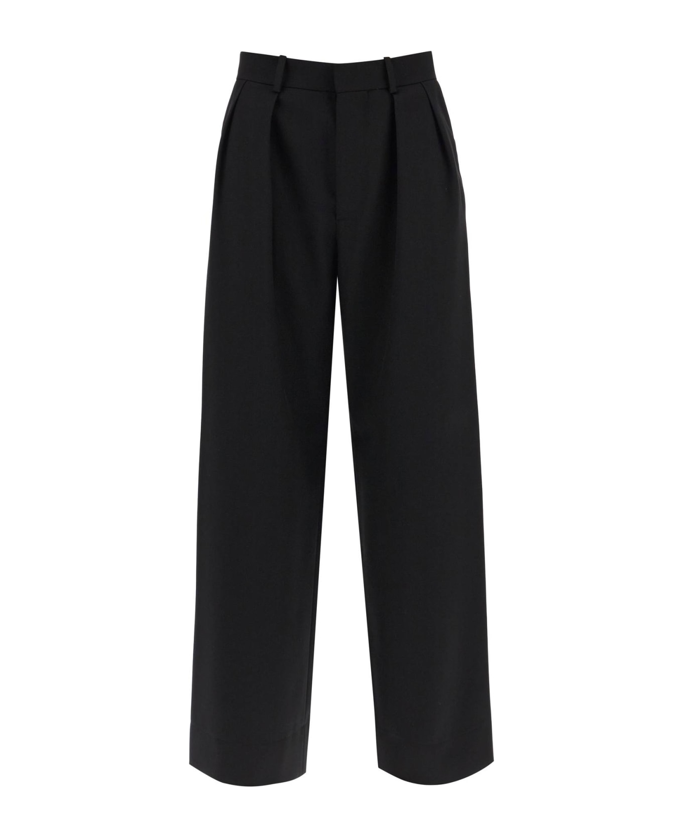 Wardrobe. NYC tailored pants crafted in lightweight virgin wool canvas. Characterized by a flared line enhanced by front pleats and wide leg, this garment features zipper and hook fly, belt loops on the waistband, side slash pockets and back welt pockets. Relaxed fit. The model is 177 cm tall and wears size XS.