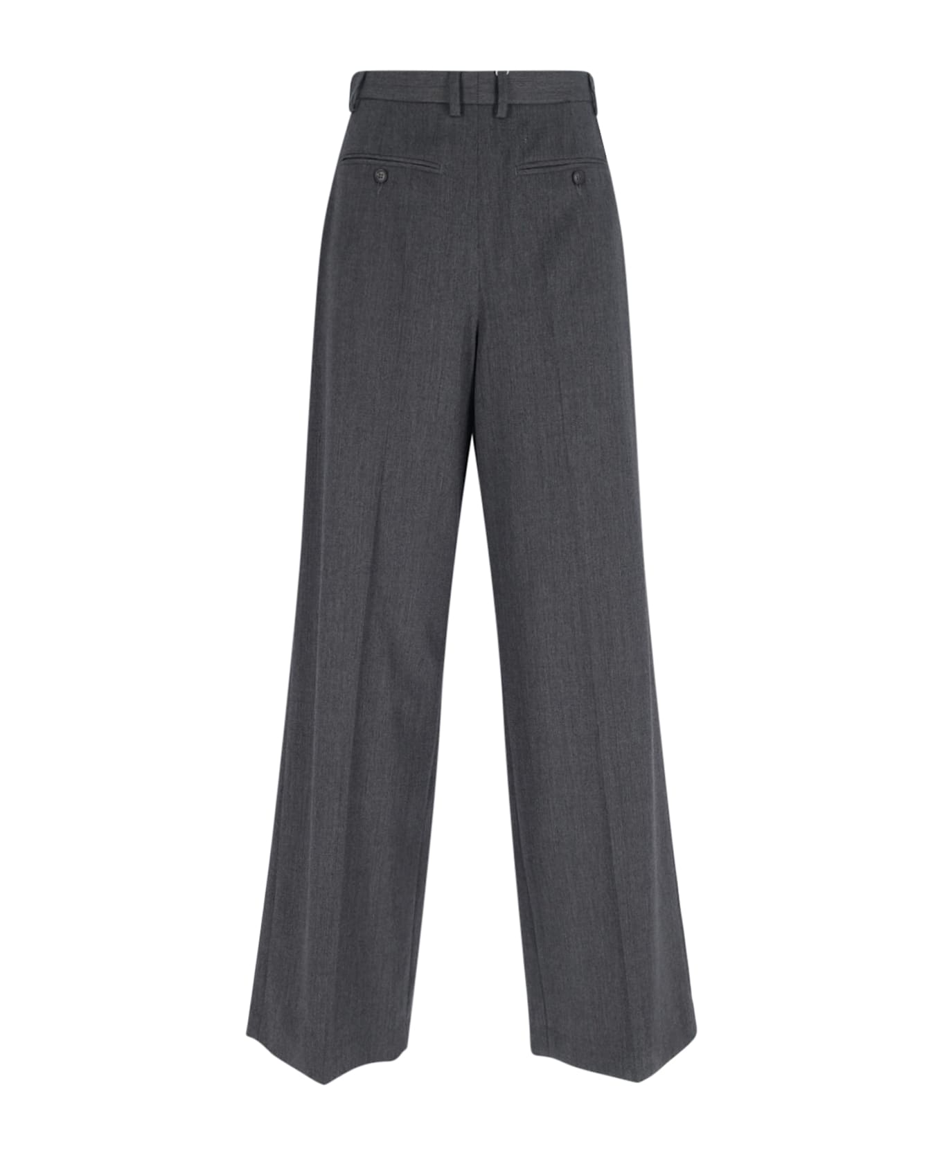 Maison Margiela MM6 tailored trousers in grey virgin wool blend with high waist, belt loops, two front button welt pockets, side zip closure, white logo stitching on the back, two back button welt pockets, wide leg.
