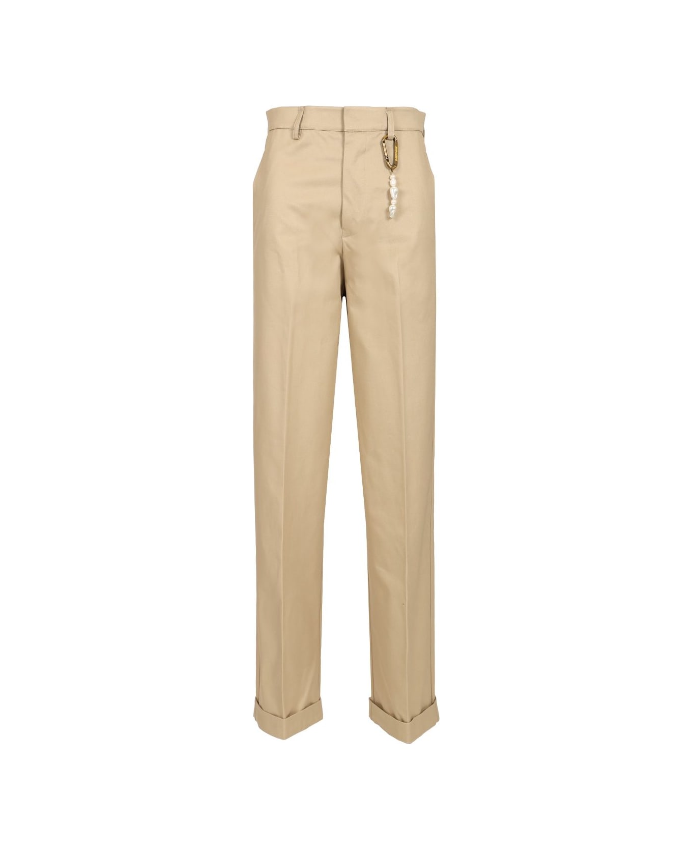 "Tomi" straight leg trousers in stone beige Japanese twill by Darkpark. Mid-rise. Front button and zip fastening. Four pockets. Pearl chain decoration and detachable lobster clasp.