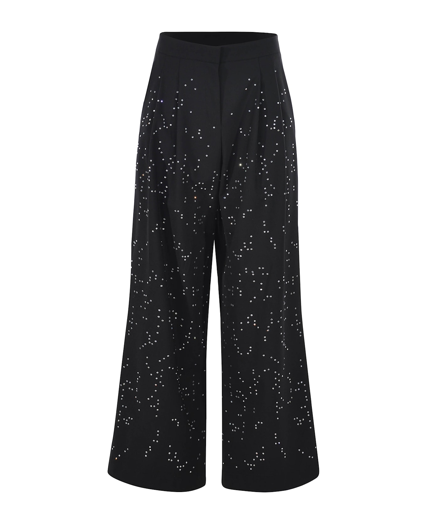 Trousers Alysi in wool blend Black. Rhinestones applied on the front. Closure with hidden hook, zip and button. Pence on the front. Side welt pockets. Back welt pocket with button. Wide leg. Oversized fit. 53% polyester 43% virgin wool 4% elastane. Made in Italy