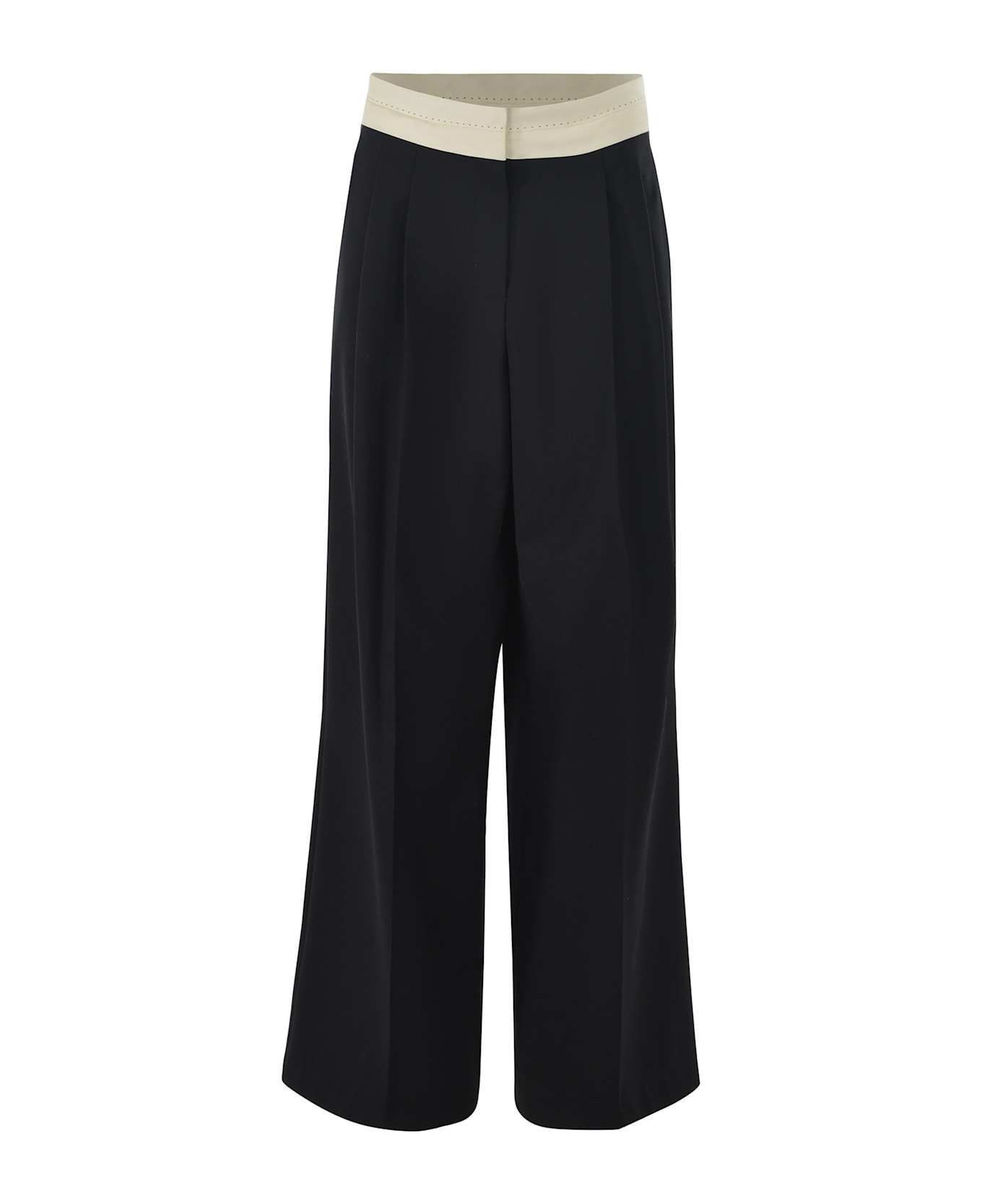 Trousers Alysi in wool blend Black. Concealed hook, zip and button fastening. Contrasting waistband. Pence on the front. Side welt pockets. Back welt pocket with button. Wide leg. Oversized fit. 53% polyester 43% virgin wool 4% elastane. Made in Italy