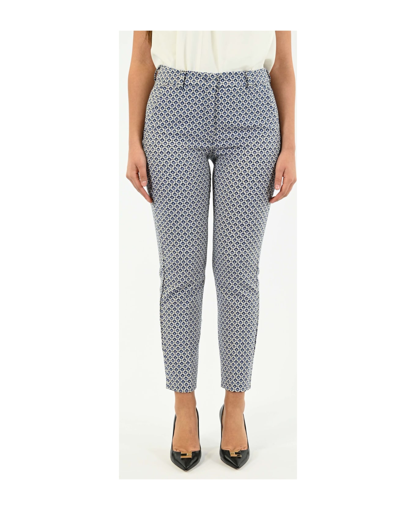 slim fit jacquard cotton trousers, closed with hook and hidden zip. slant pockets in front and welt pockets with button in back. ironed crease. composition and washing 57% polyester, 40% cotton, 3% elastane. in the washing machine max 30 degrees reduced mechanical action; do not bleach; do not tumble dry; hang dry in the shade; lukewarm iron max 110 degrees c; delicate dry cleaning with perchlorethylene.