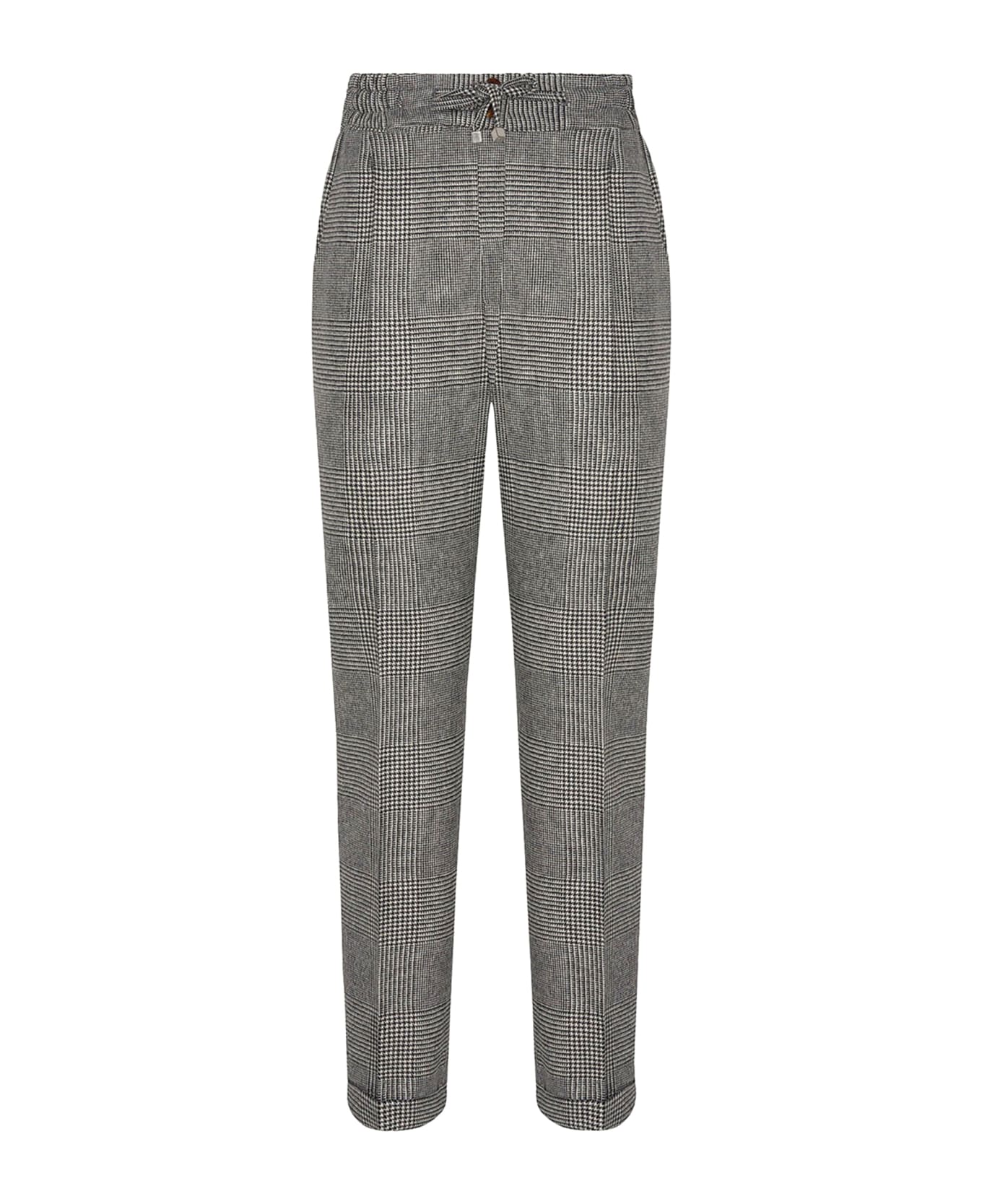 Drawstring trousers made from an exclusive blend of wool and cashmere with a glen plaid pattern intertwining shades of grey and black, entirely cut and sewn by hand by our master tailors in Naples. . Ankle-length leg; 2 cm turn-upcuff. These Kiton trousers can be worn on any occasion, whether styled with a sporty look or paired with a jacket for a casual-chic ensemble. To maintain the beauty of your Kiton garment, we recommend professional laundering and pressing.