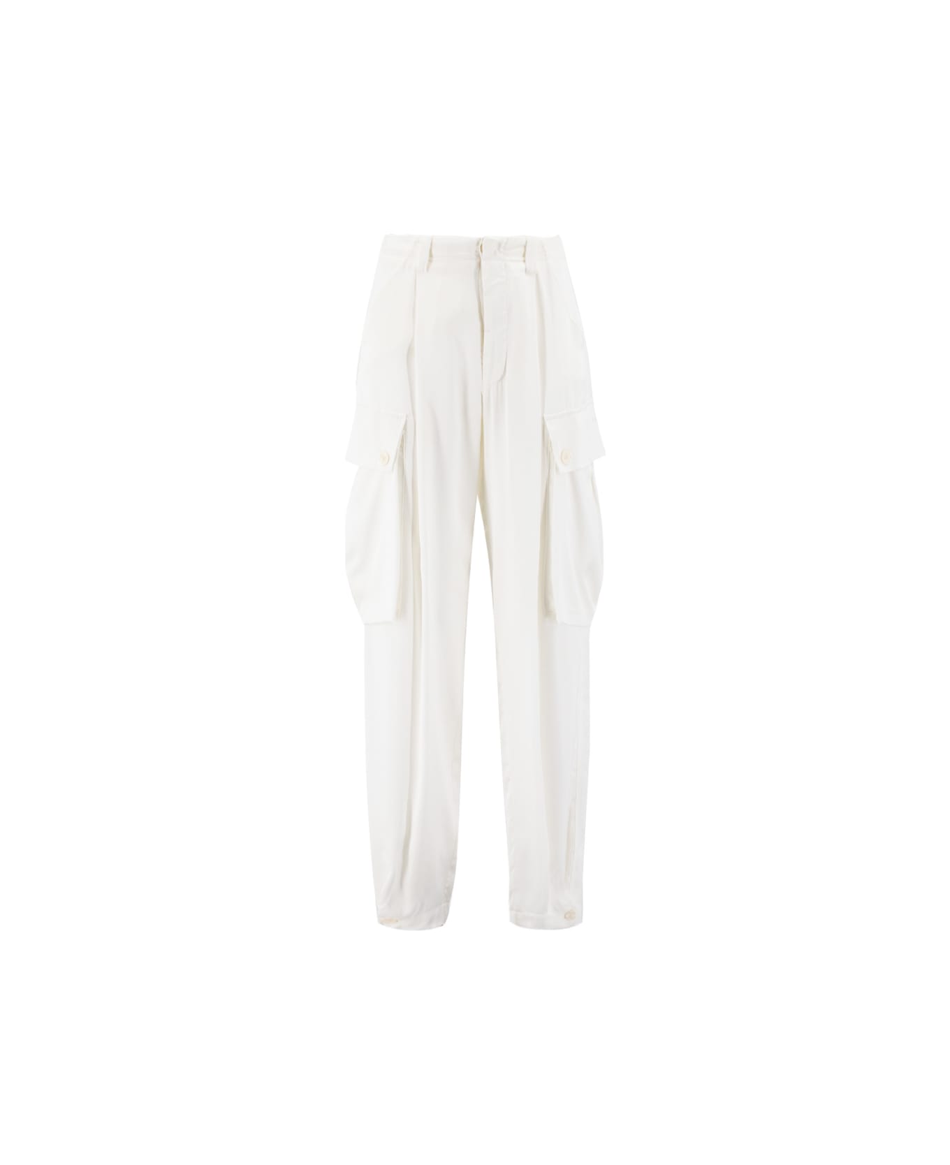 Viscose cargo trousers, characterised by two large side pockets with flap and buttons, front fastening with concealed zip and button, regular fit.