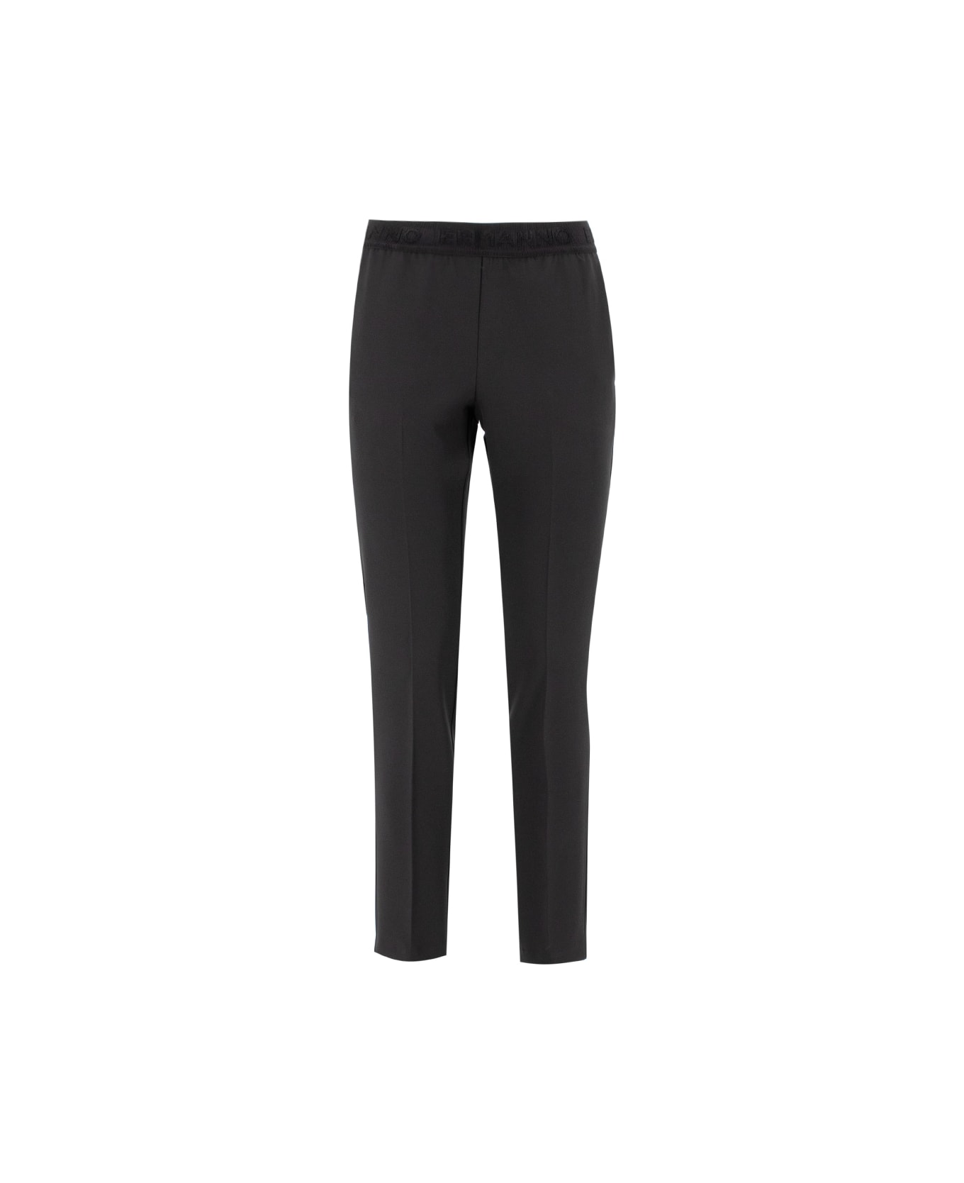 Tailored cut trousers with high waist and straight leg, elastic logo band at waist, flush side pockets, regular fit.
