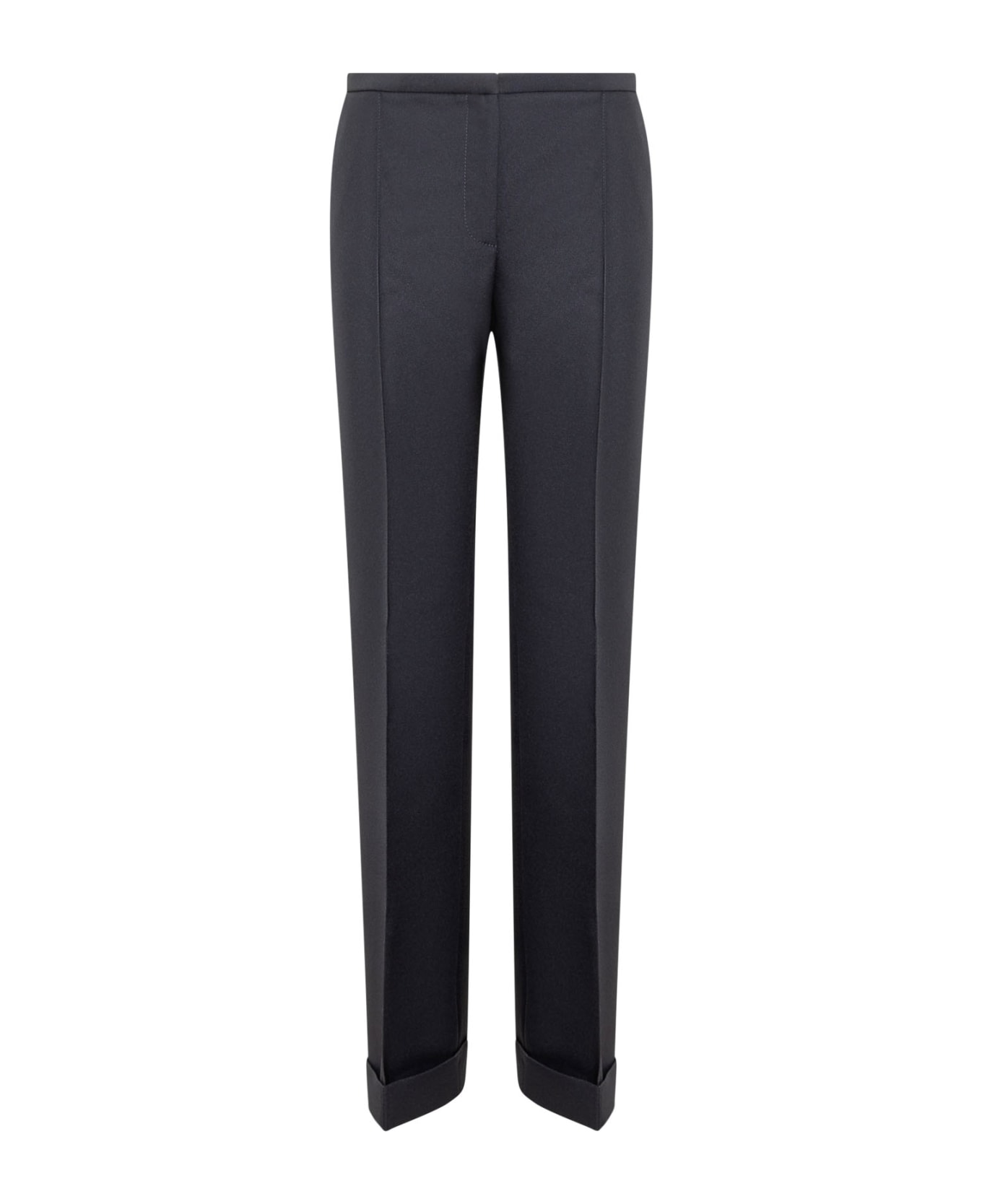 Long blue trousers. Front and back pockets. Turn-ups on the bottom. Hook and zip closure.
