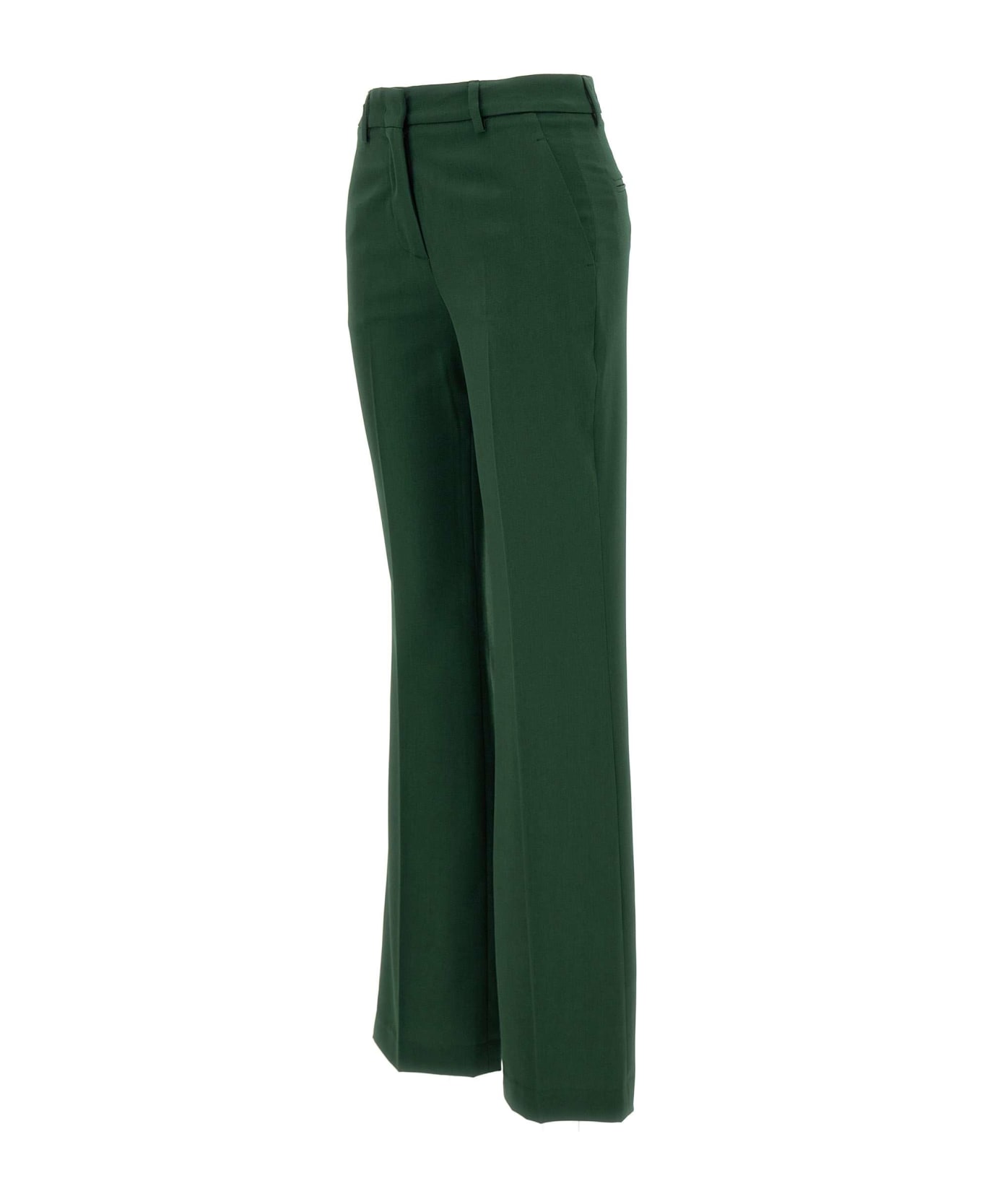 Vivetta woman wool blend pants, bottle green, waist with belt loops, hook and button fastening, two side slit pockets, contrasting pink profiles inside, two back pockets, wide leg line, ideal for autumn season and winter. Made in Italy.