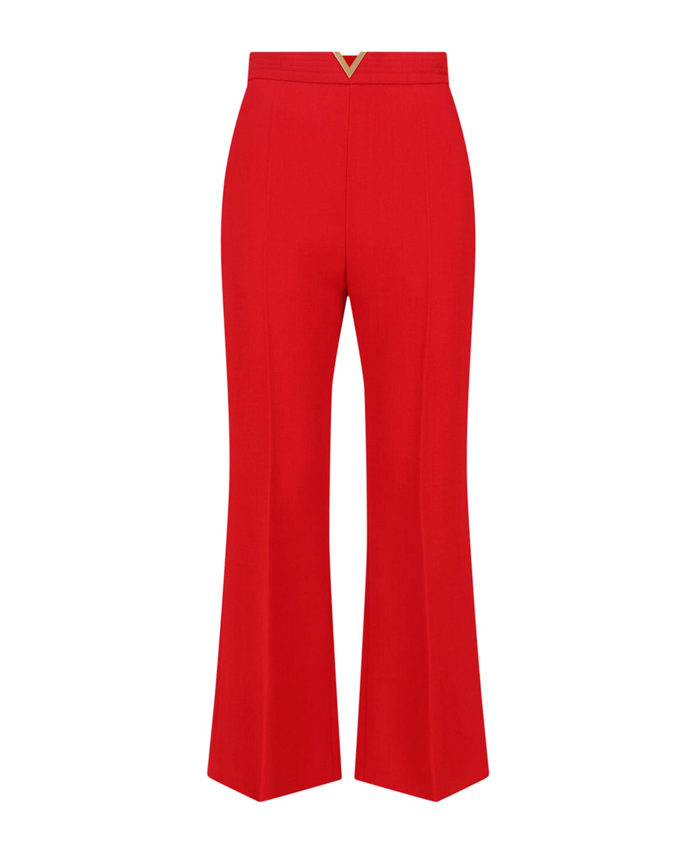 Valentino "vlogo signature" red virgin wool pants with high waist, strap at the waist, gold metal "vlogo signature" logo detail at the waist, two side pockets, two back welt pockets, wide leg. Composition: 100% Virgin Wool