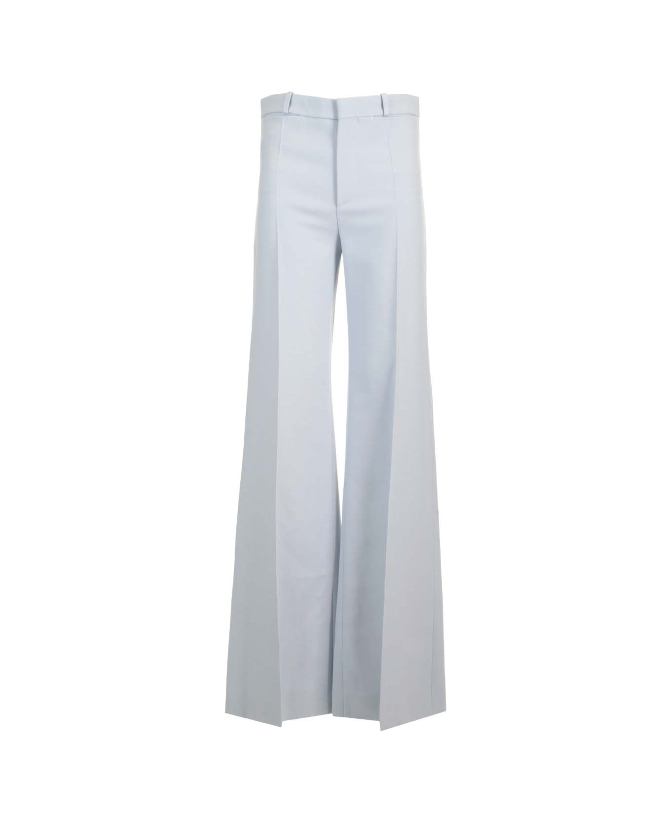 Flared trousers in powder blue wool crepe from Chloè, with high waist and belt with belt loops, front zip and hook closure, front pockets. Slim fit. Composition: 100% WOOL DOMESTIC SHEEP VIRGIN WOOL OVIS ARIES ARIES Australia FARMED/POCKET LINING: 51% VISCOSE ; 49% COTTON