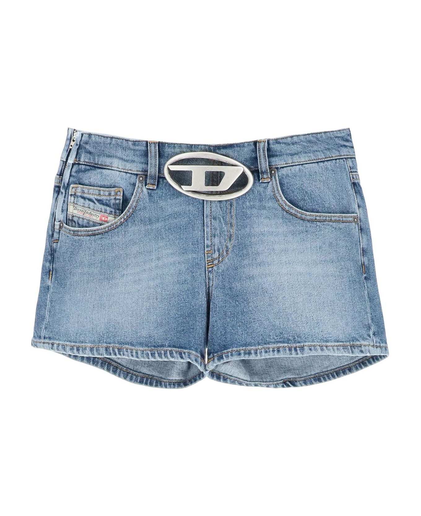 Diesel five-pocket in medium-wash stretch denim with a low waist and slim fit. They feature side zip fly and cut out antiqued metal D-Oval logo buckle. Finished with classic detail on the fifth pocket. The model is 177 cm tall and wears a size 26. Composition: 99%CO, 1%EA