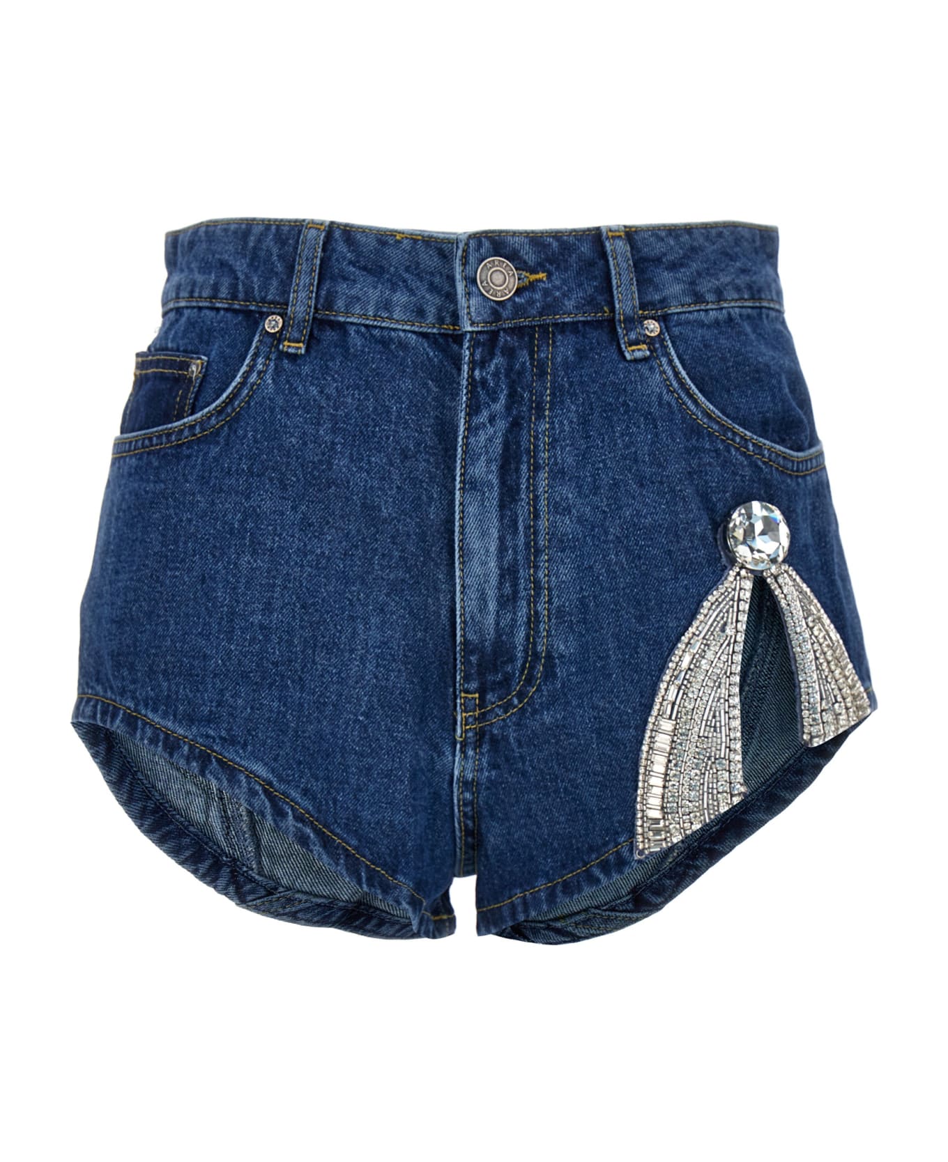 Deco Bow Hot' cotton denim shorts with side cut out detail with crystal appliqués, zip and button closure, pockets and a back heart embroidery detail.