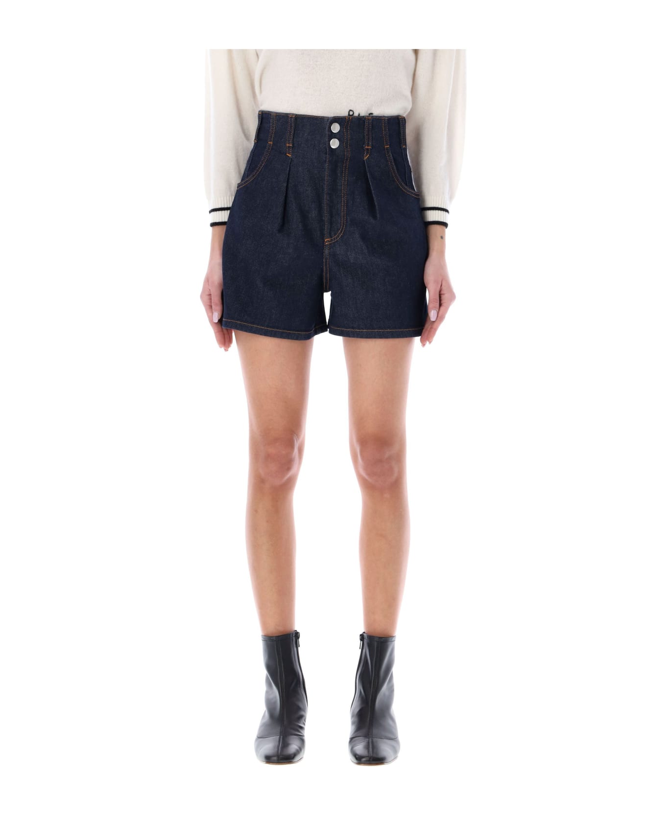 Cotton Blend High-waist Denim Shorts By Philosophy By Lorenzo Serafini. Featuring: High Waist Snap Buttons And Zip Fastening Belt Loops Slit Pockets Contrasting Stitching Rear Patch Pockets Single Pleat At Front Model Is 1,72 M Tall And She Is Wearing Size 40