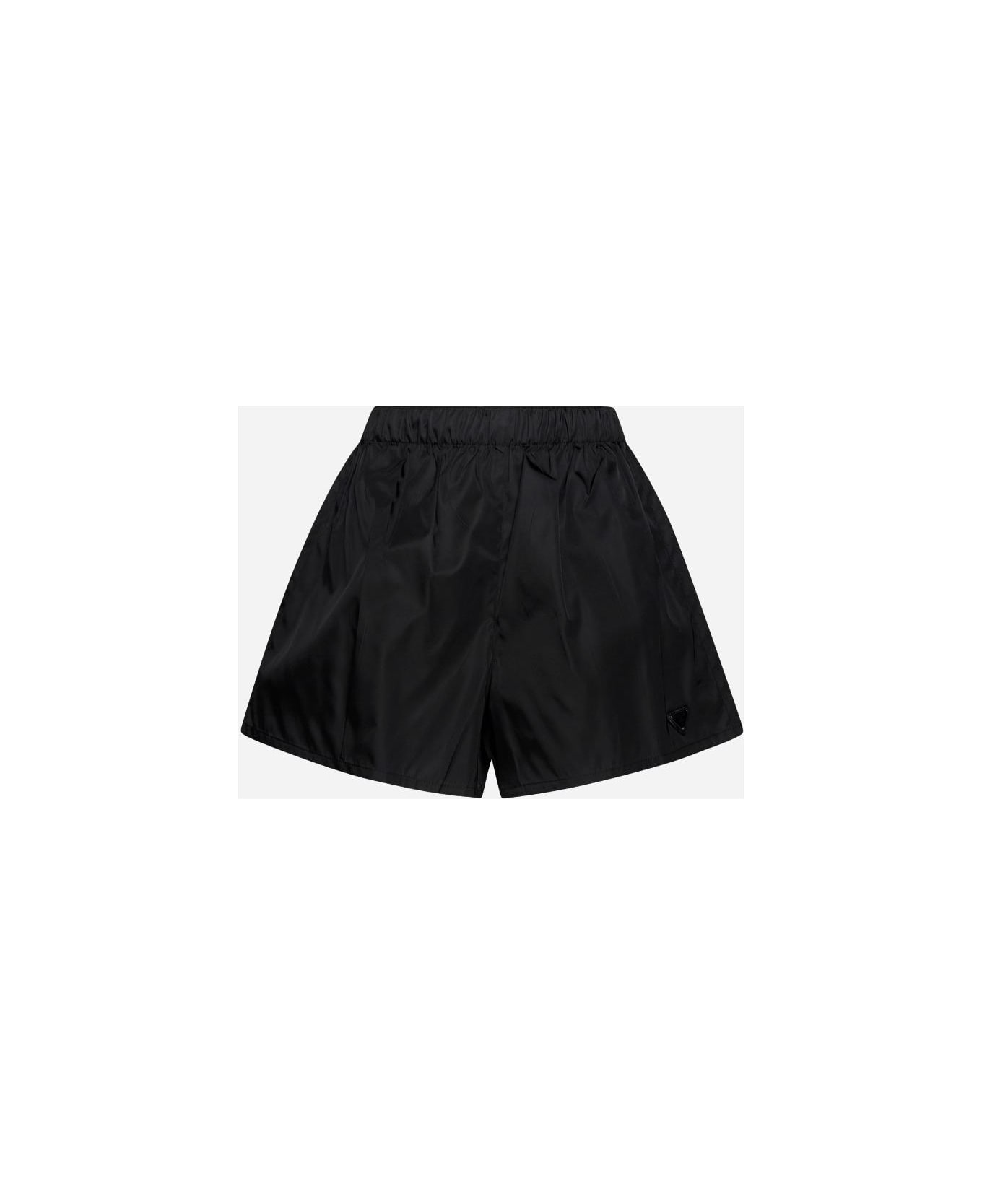 Prada's black Re-Nylon shorts featuring elasticated waistband, side pockets, triangle logo plaque on the front and wide leg. Composition: 100% recycled polyamide