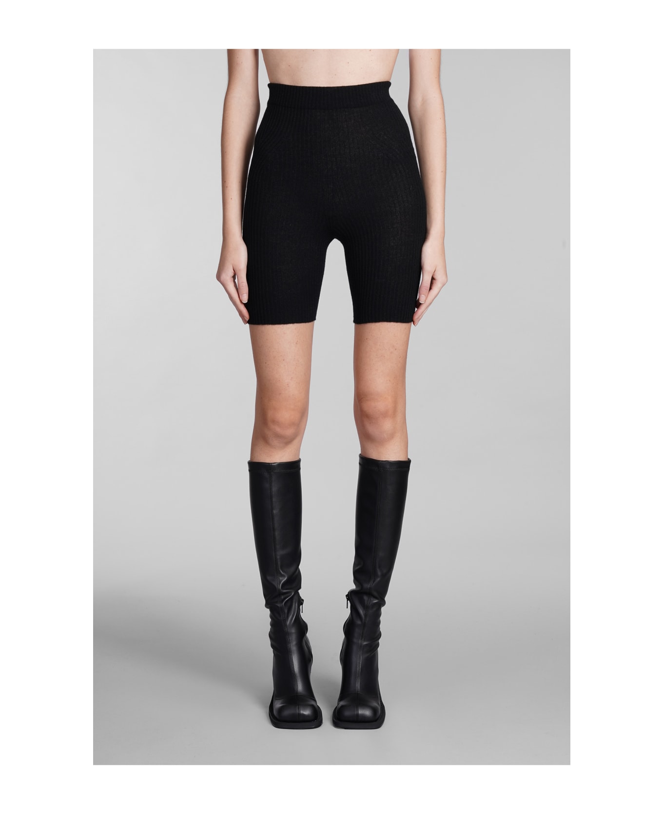 Shorts in black wool, high waist, cyclist, ribbed knit, 82% wool, 4% lycra, 14% cashmere, Made in Italy, model is 180 cm and wears size 40