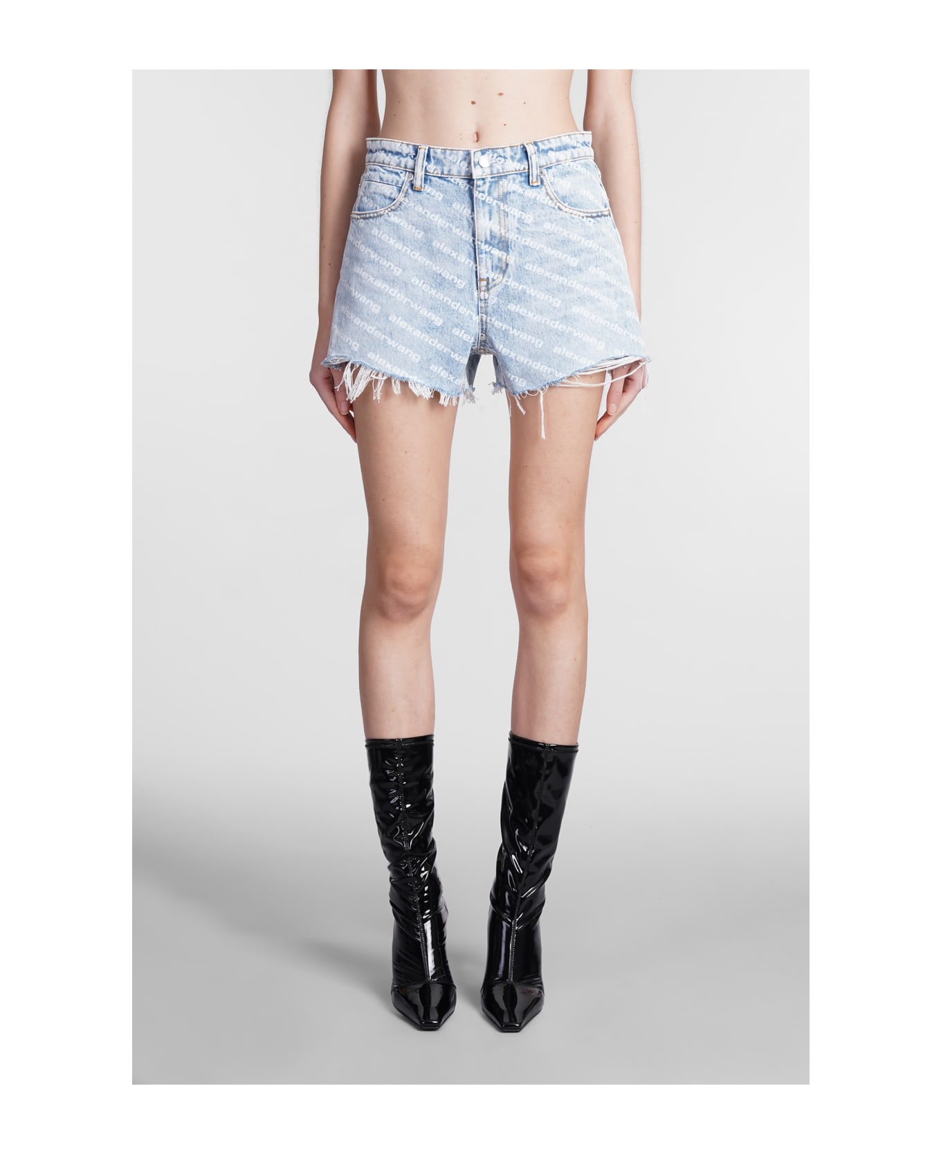 Shorts in cyan denim, button and zip closure, waist belt loops, five pockets, frayed edges, 100% cotton, Made in China, model is 180 cm and wears size 27