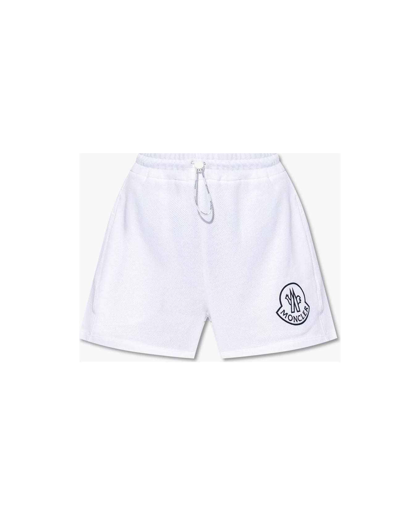 White shorts from Moncler. This pair feature an elastic drawstring waistband, navy logo print and two slip pockets.