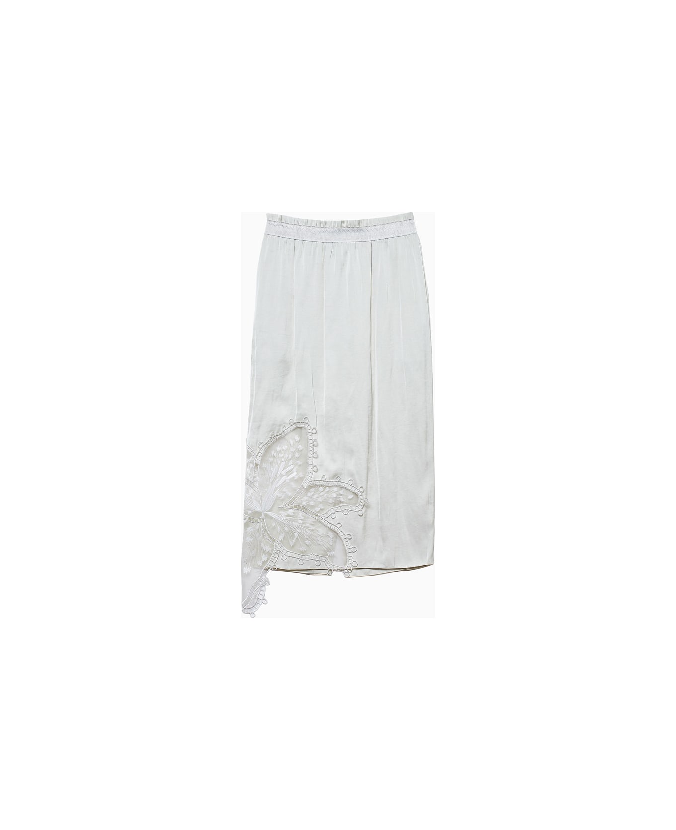 made in italy skirt in one-color fabric. high waist with elastic band and micro ruffles. color matched hemstitch floral embroidery at front side. back slit. unlined. regular fit. composition 100% polyester.