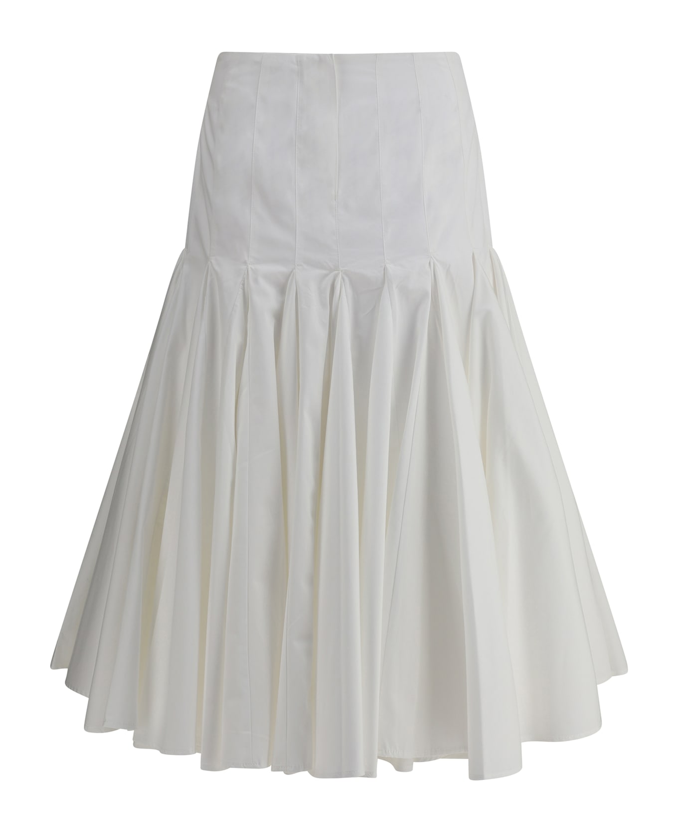 The agave midi skirt by jacquemus is a structured, contemporary piece that plays with volume and tailored details. high-waisted and below-the-knee length, it features a flared line achieved thanks to sewn pleats that open from the hips down, supported by a light tulle lining for a sculptural effect. the smooth back waistband is embellished with the brand's distinctive metal "j" loop, while the trompe l' il back pocket adds an unexpected ironic touch. concealed zipper and button closure for a clean, elegant finish.