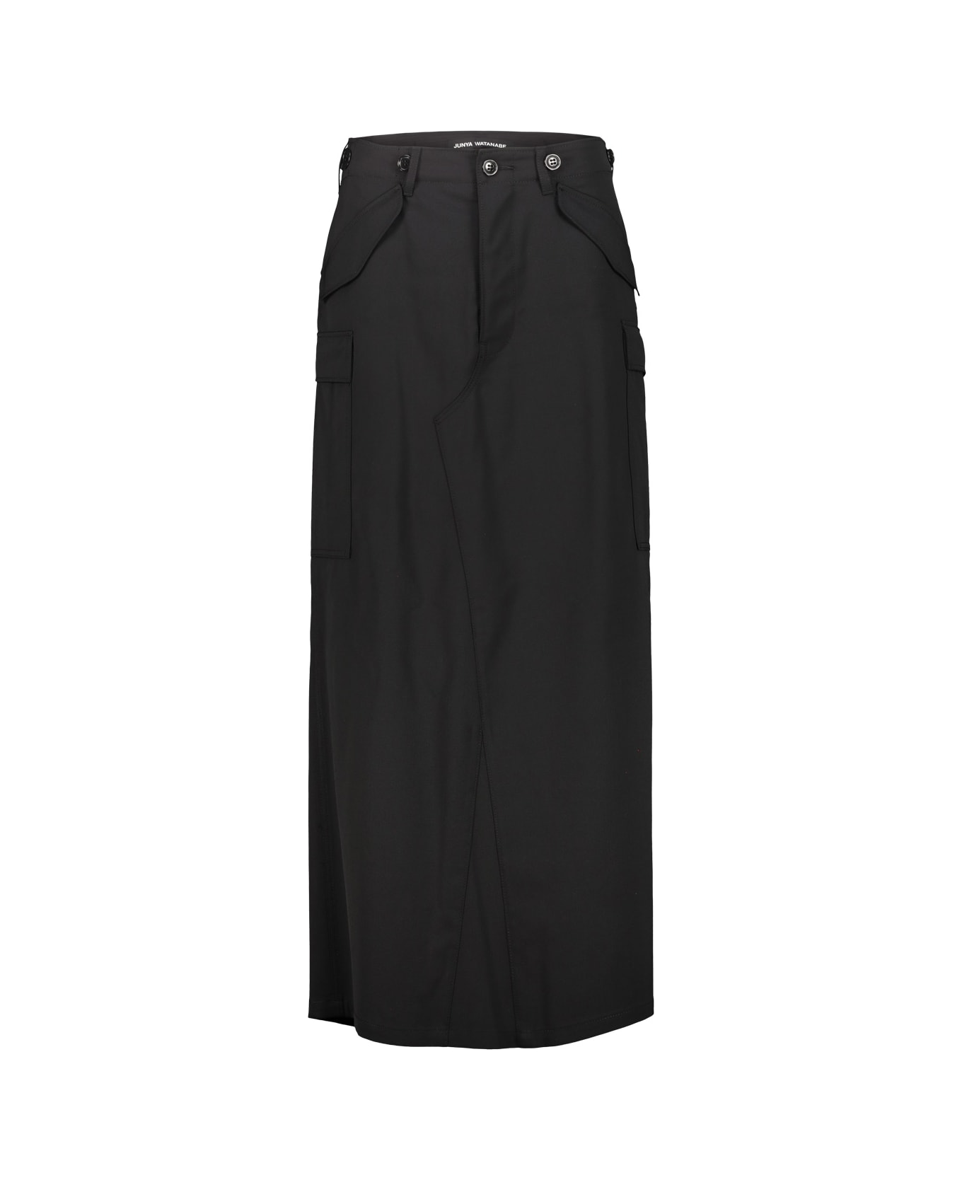 Junya Watanabe cargo skirt created from unstructured trousers, two flap pockets on the sides, two side cargo pockets, two flap pockets on the back, button detail on the waist, slit on the back. GTIN code: JOS011