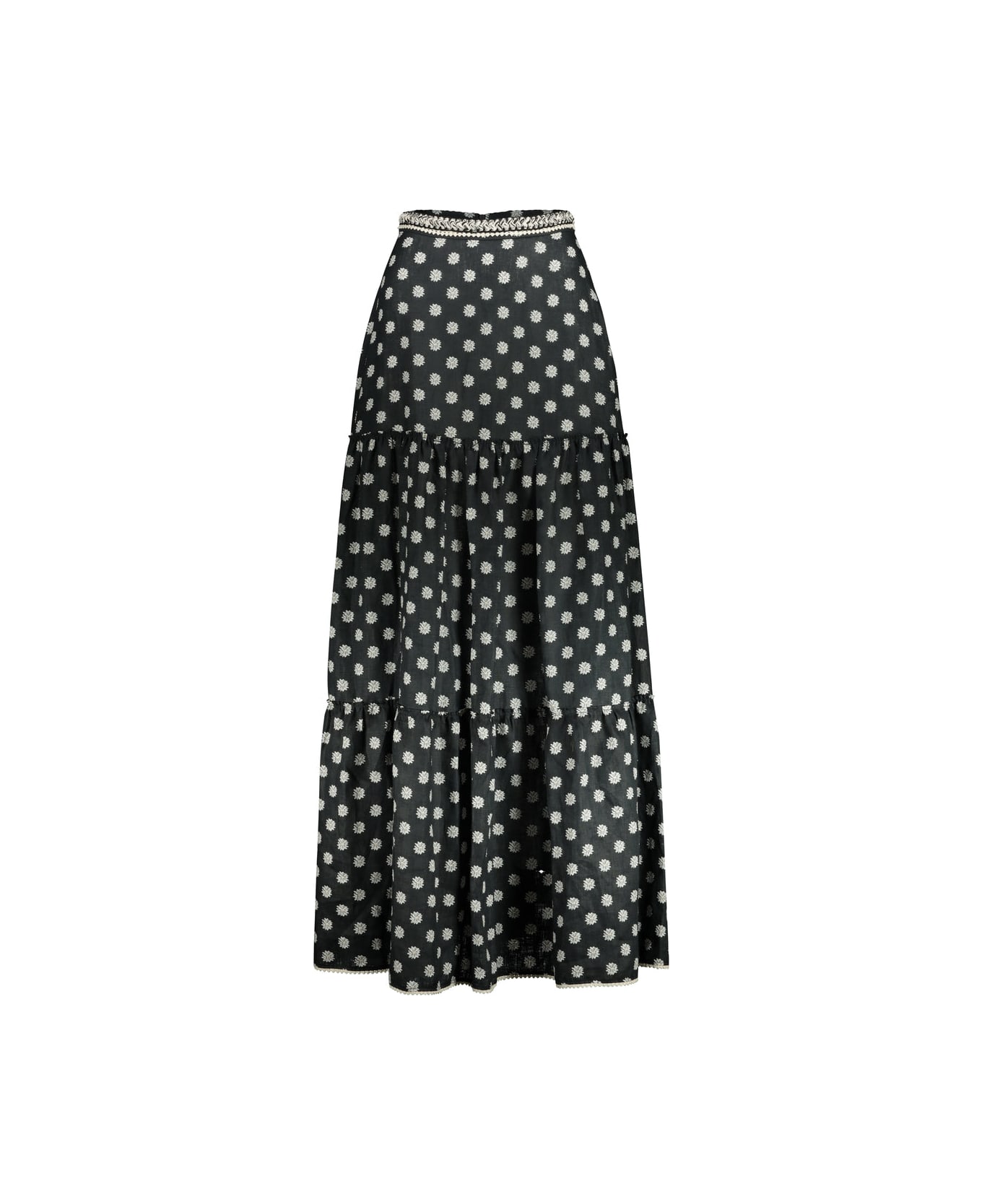 Long boho-style skirt in pure linen, the "Charlotte" features high-rise and voluminous flounces. Iconic SS23 Daisy print.