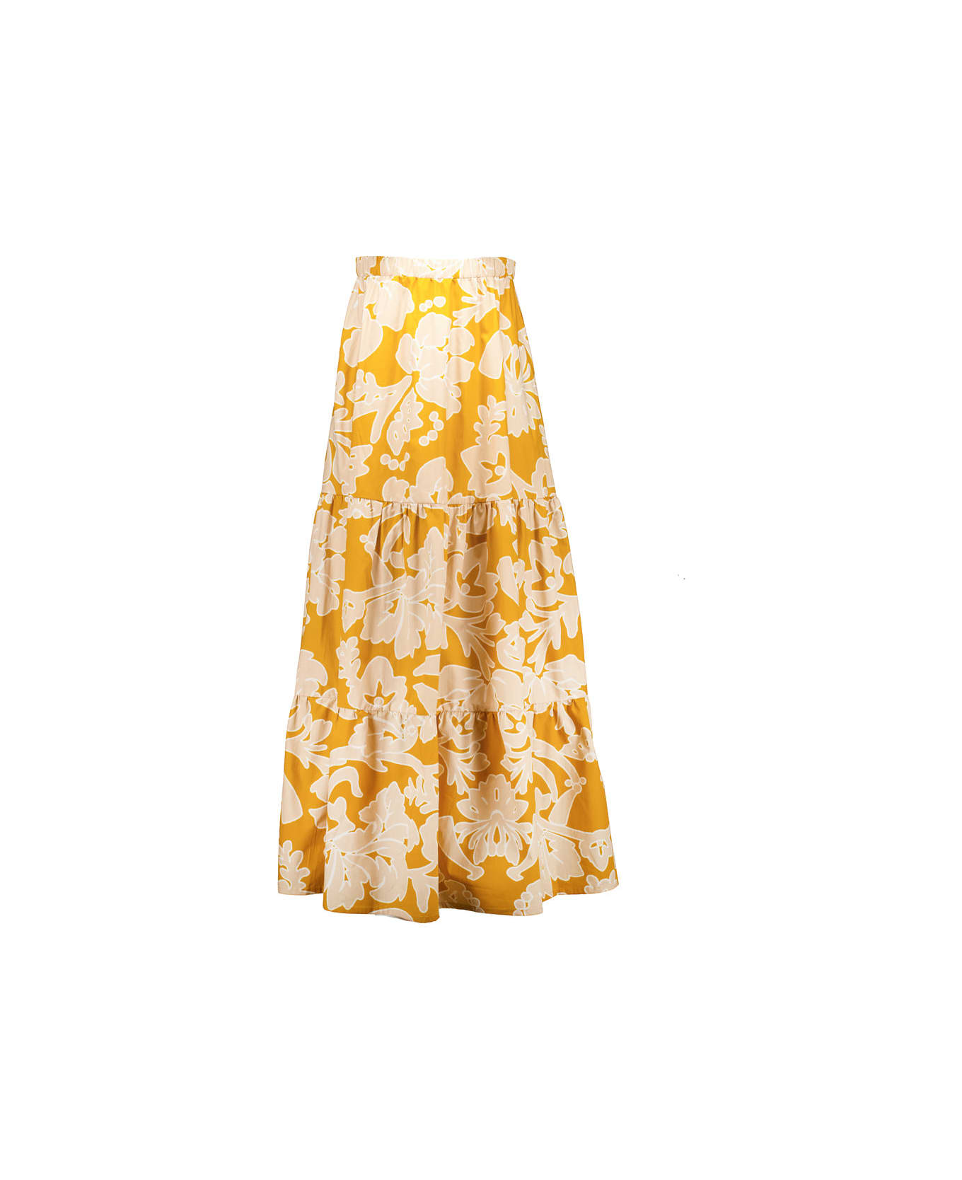Charlotte skirt in the pattern of the season, ochre with ton-sur-ton flowers. This bohemian style floor length skirt features high-waist and flowing ruffles.