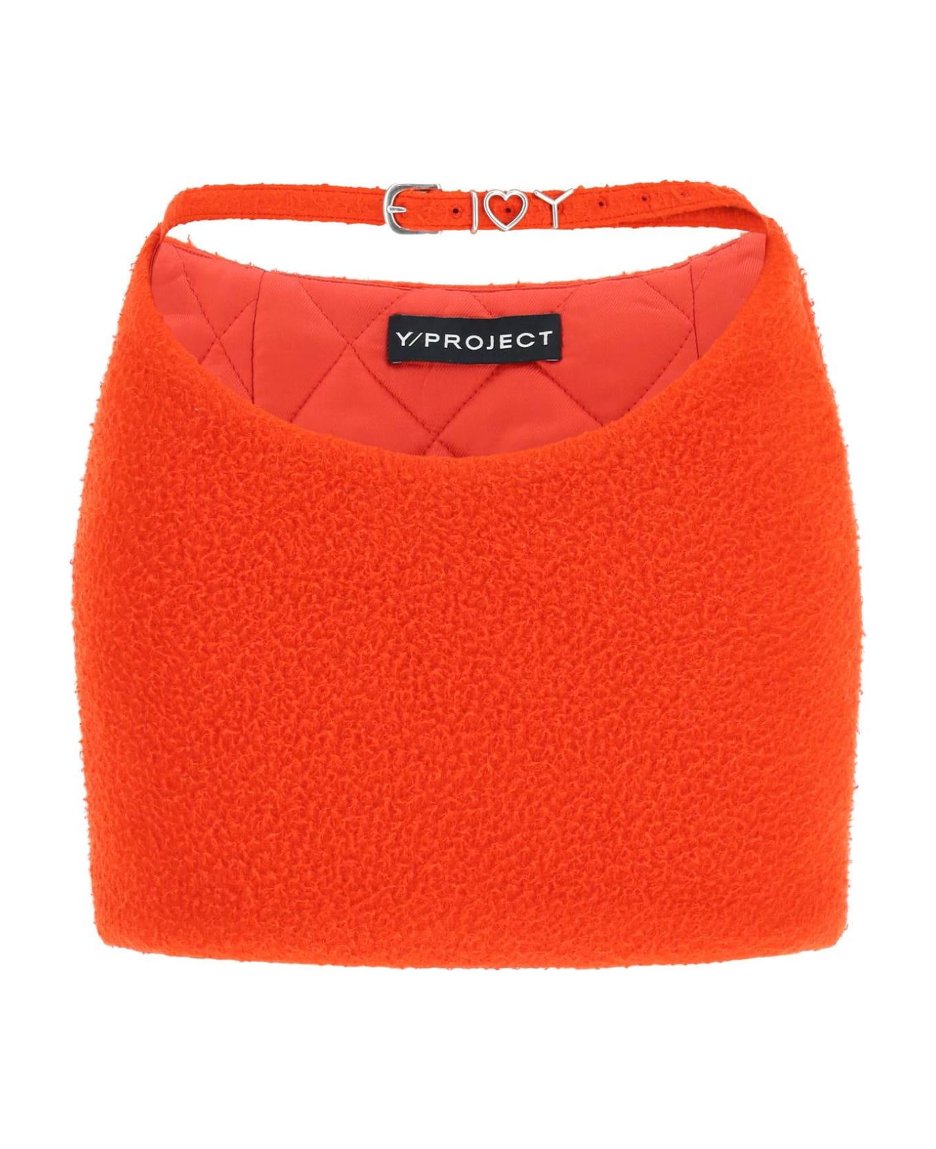 Y/Project high-rise mini skirt made of virgin wool, alpaca and cashmere bouclé fabric. It features a thin matching buckle belt enriched by metallic lettering details and a shaped cut-out at waist. Straight cut with regular fit, finished with diamond-quilted lining. The model is 177 cm tall and wears a size FR 36.