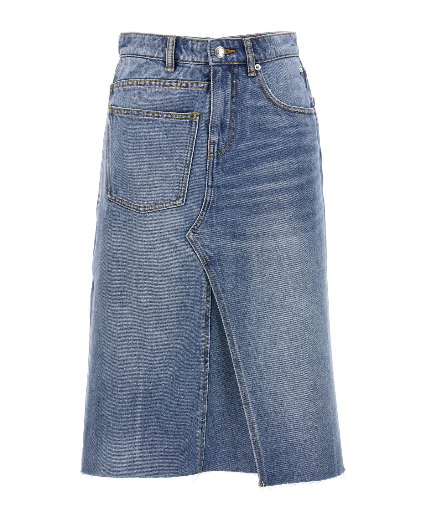 Deconstructed skirt in cotton denim with zip and button closure, pockets, embroidery detail.