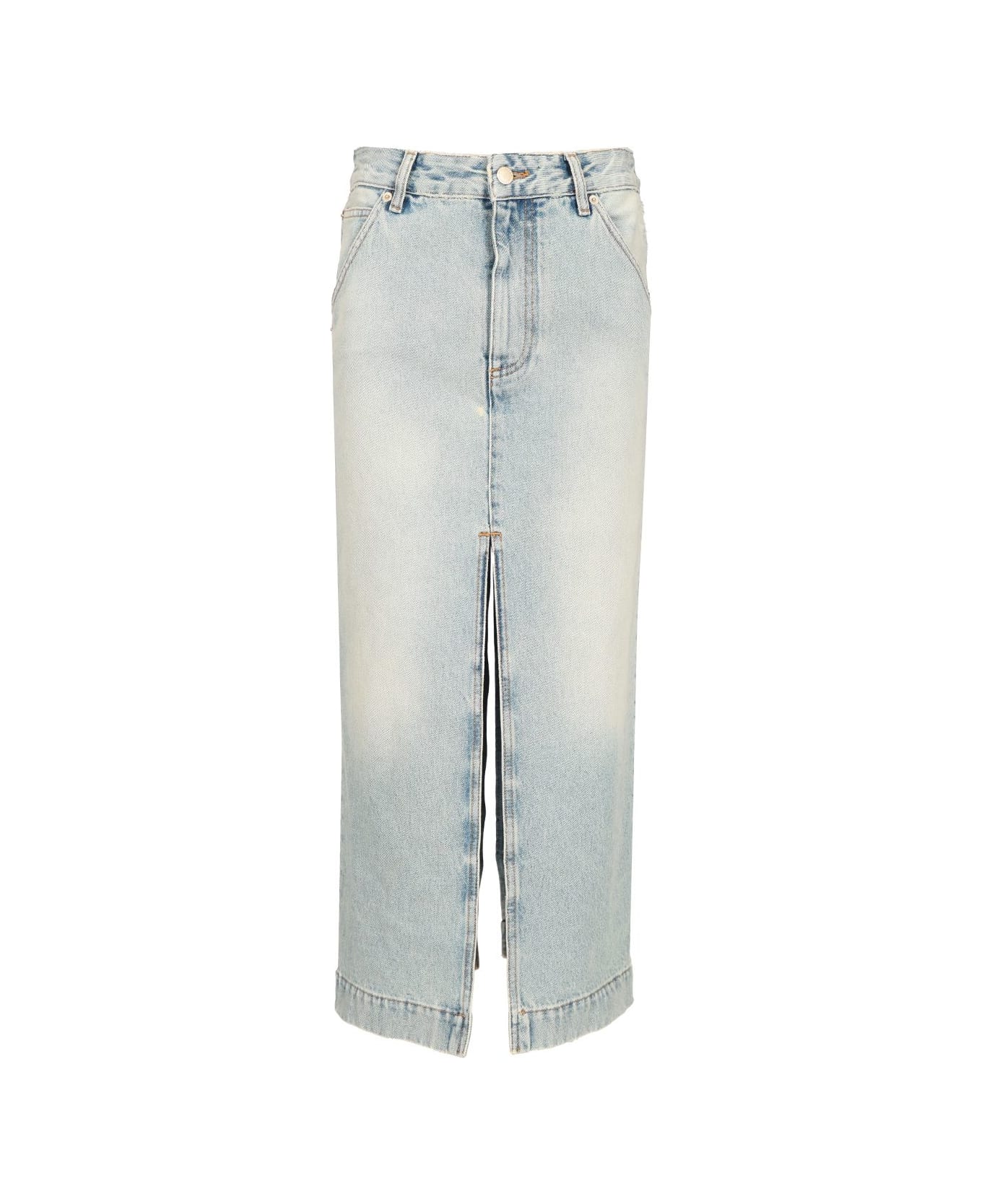 Light wash denim midi skirt with front and back slit from Darkpark.