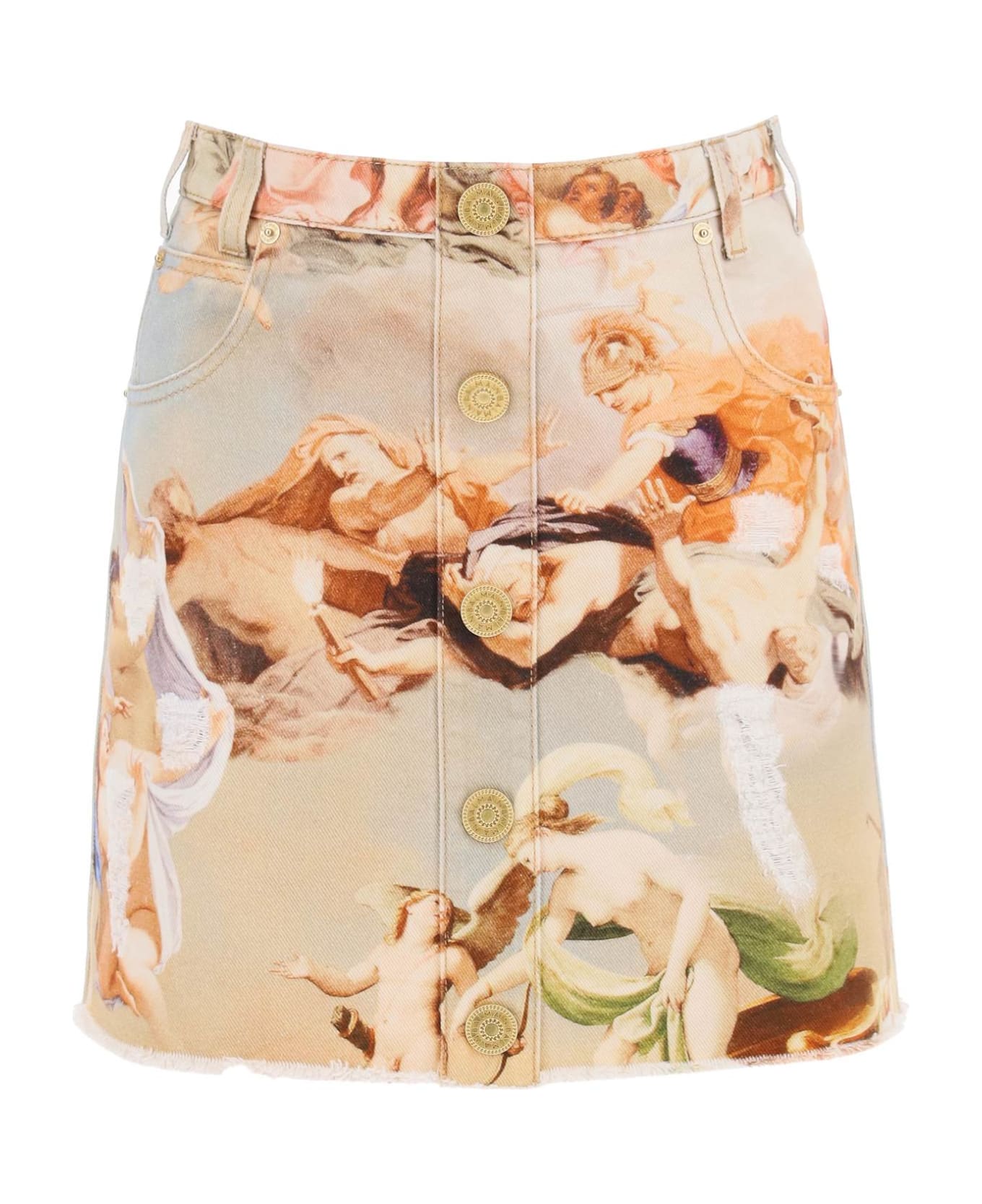 Balmain mini skirt crafted in pure cotton denim with the iconic Sky print all-over. Five-pocket design characterized by back closure with maxi gold-tone zipper featuring belt loops on the waistband and frayed hem. Embellished with ornamental logo buttons on the front. Fitted with high-rise waist. The model is 177 cm tall and wears size FR 36. Composition: 100% CO