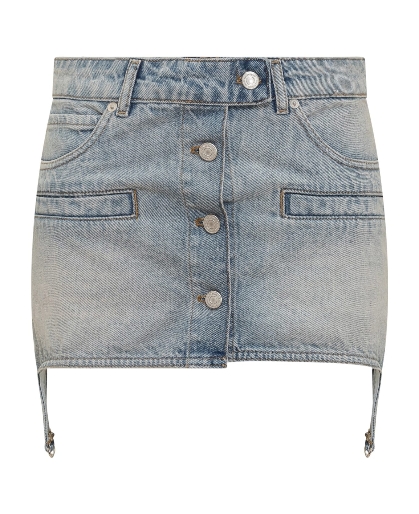 Denim miniskirt. Button closure. Belt loops. Seven pockets. Embroidered logo on the back.