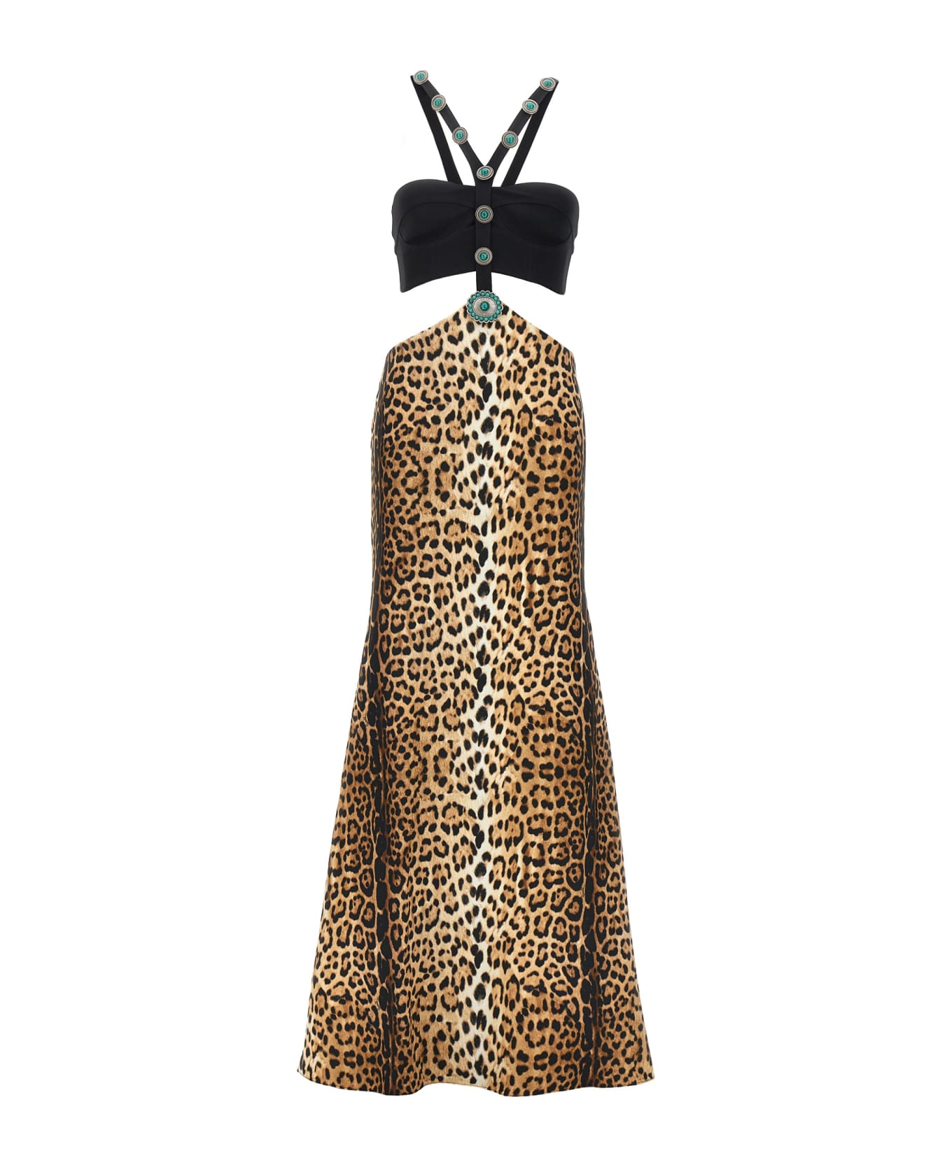 Long dress in stretch fabric with metal details, cut out details at the waist, back zip closure, animal print skirt.