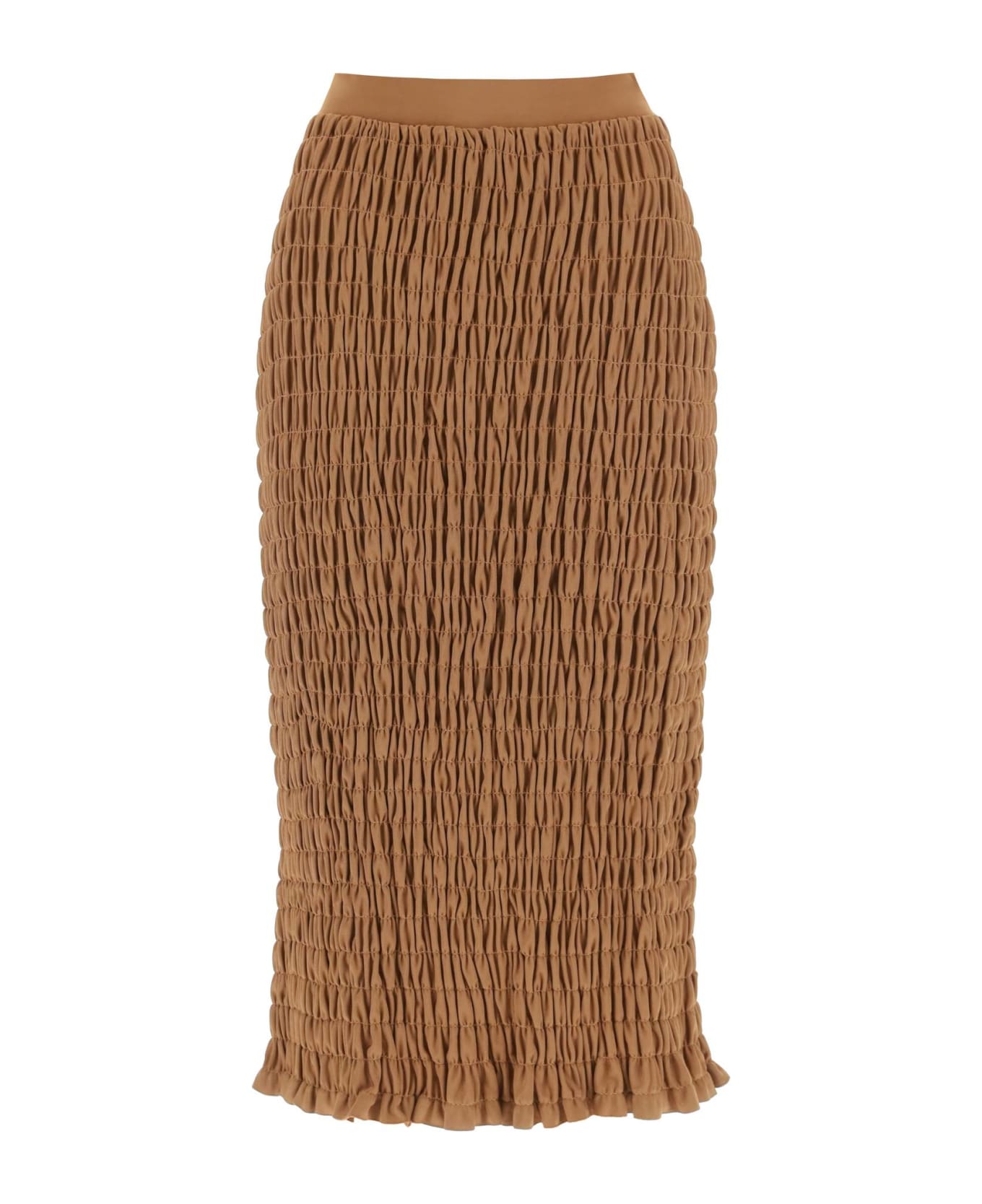 By Malene Birger pencil skirt crafted in smocked stretch viscose blend. It features elasticated waistband and it's characterized by a waisted fit with calf length. The model is 177 cm tall and wears size XS.