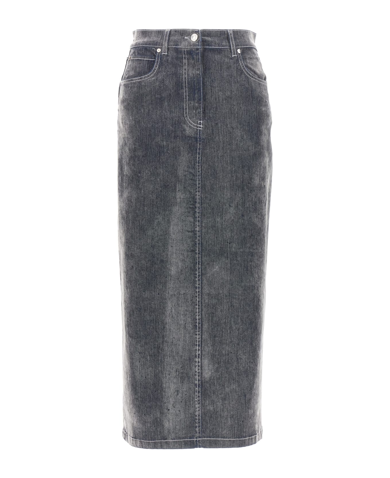 Midi skirt in flocked cotton denim with button and zip closure, five pockets, leather logo tag, back split.