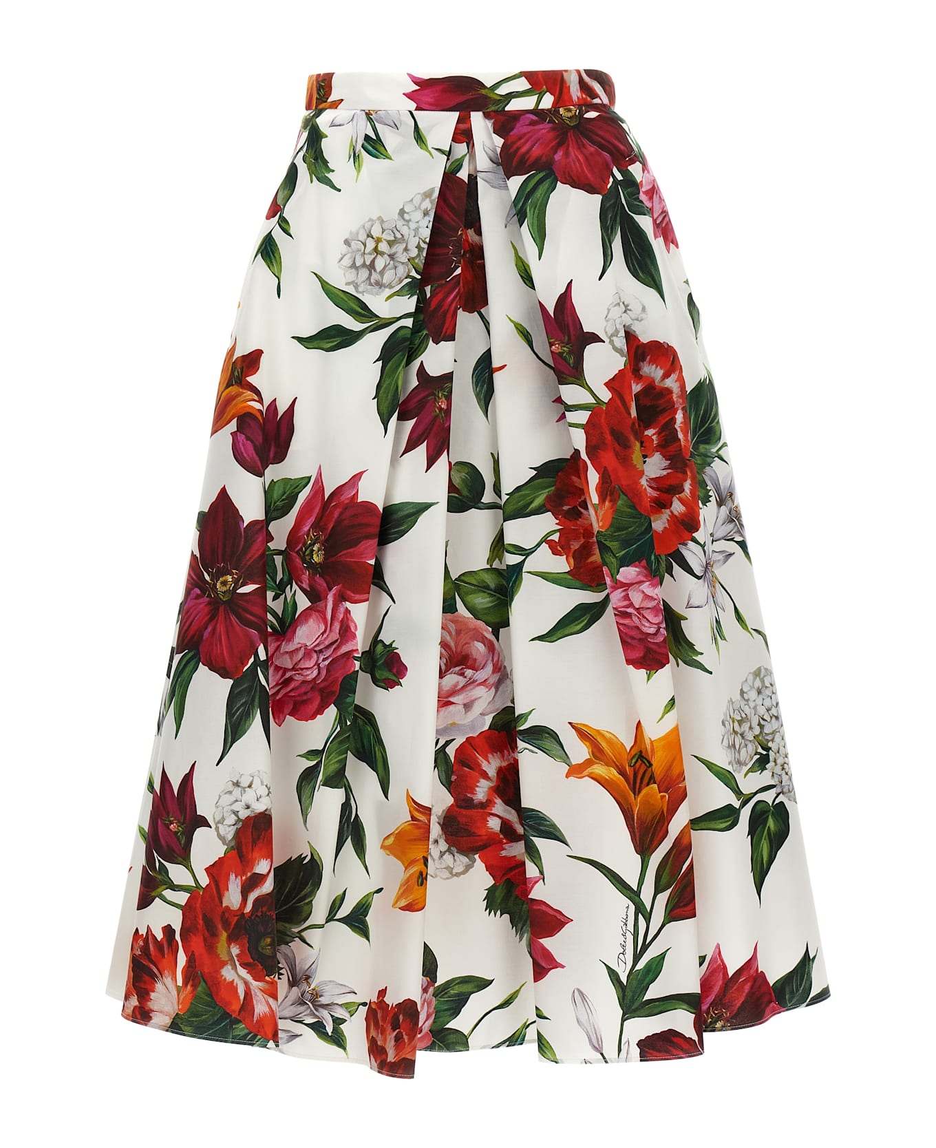 Midi skirt in all-over floral print cotton poplin with pleats at the waist, back zip closure, pockets, unlined. The differences in print placement you might find on this product is a characteristic of Dolce&Gabbana's Handmade products. A peculiarity that makes each garment or accessory unique and exclusive.
