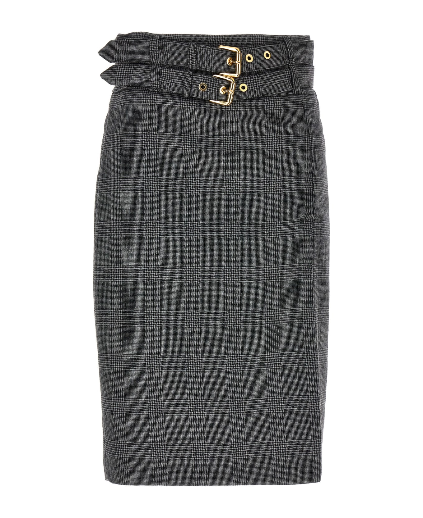 'Goldie' skirt in Prince of Wales fabric, sheath dress style with double buckle at the waist.