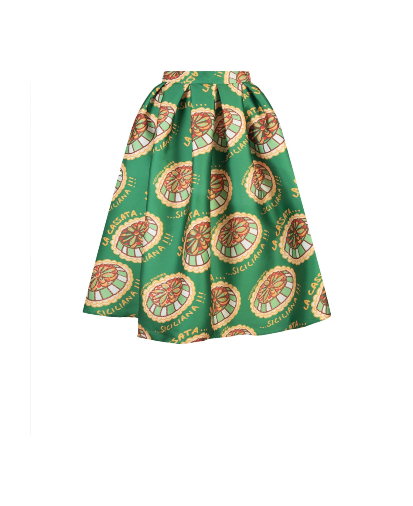 Bell-shaped midi skirt by Alessandro Enriquez made of green polyester fabric and decorated with a colourful graphic cassate print. Concealed zip fastening.