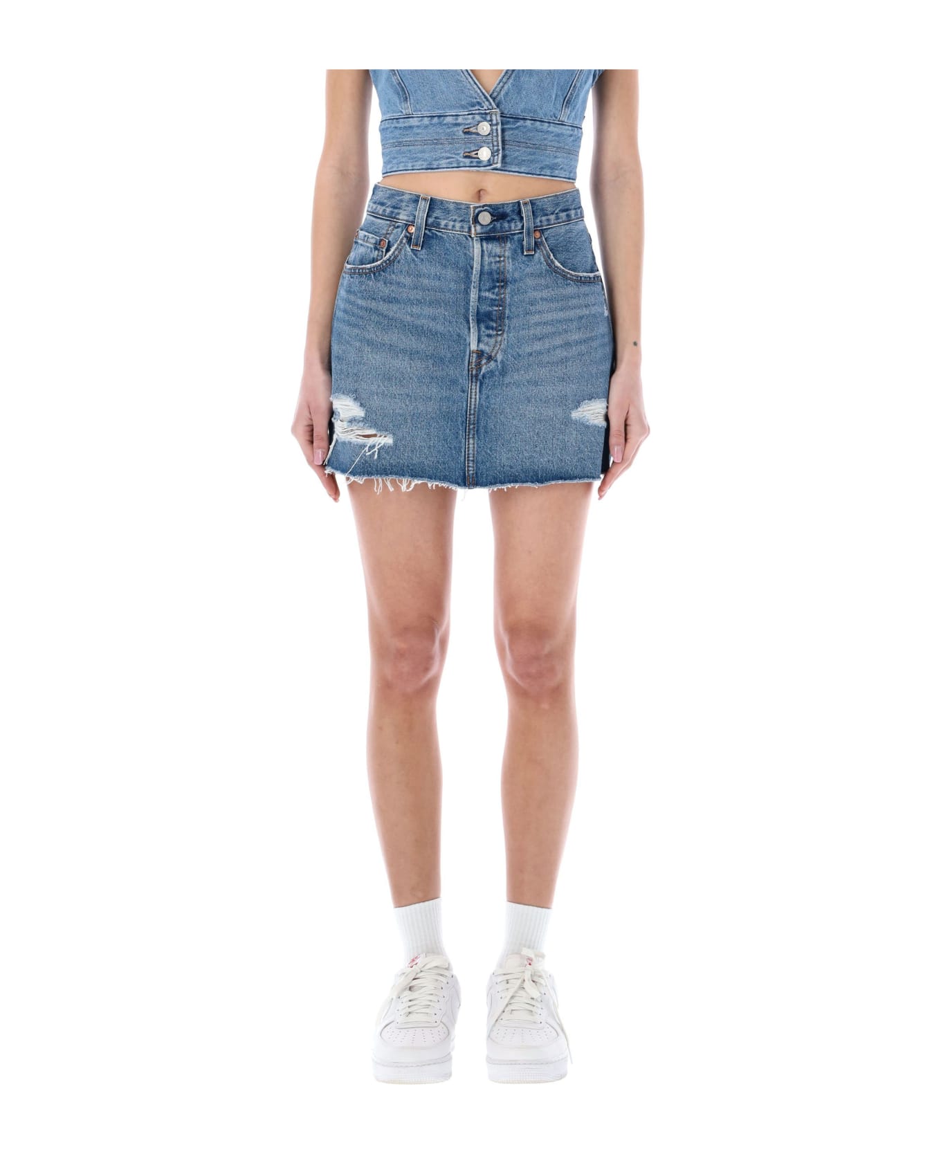 Cotton Icon Denim Skirt By Levi's. Featuring: Mid-rise Button Fastening Belt Loops Five Pockets Ripped Details Frayed Hem Leather Patch At Back Model Is 1,72 M Tall And She Is Wearing Size 27