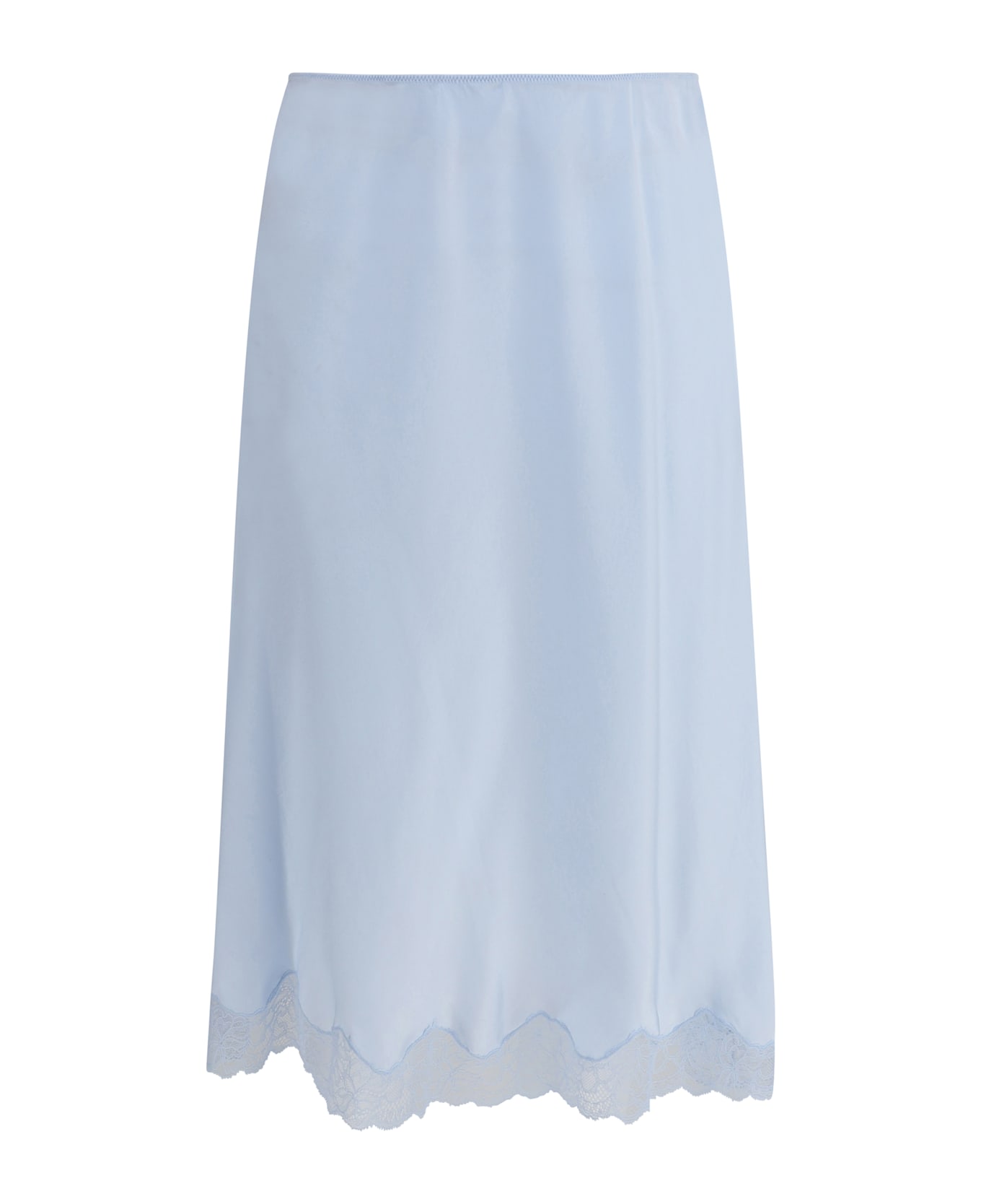 The row's irene midi skirt by the row exemplifies understated and refined elegance. made of fine silk charmeuse, it glides gently over the silhouette giving a fluid and sophisticated fit. the elasticized waist offers comfort without sacrificing style, while the tone-on-tone lace trim adds a feminine and refined detail, perfectly in line with the brand's essential and luxurious aesthetic.