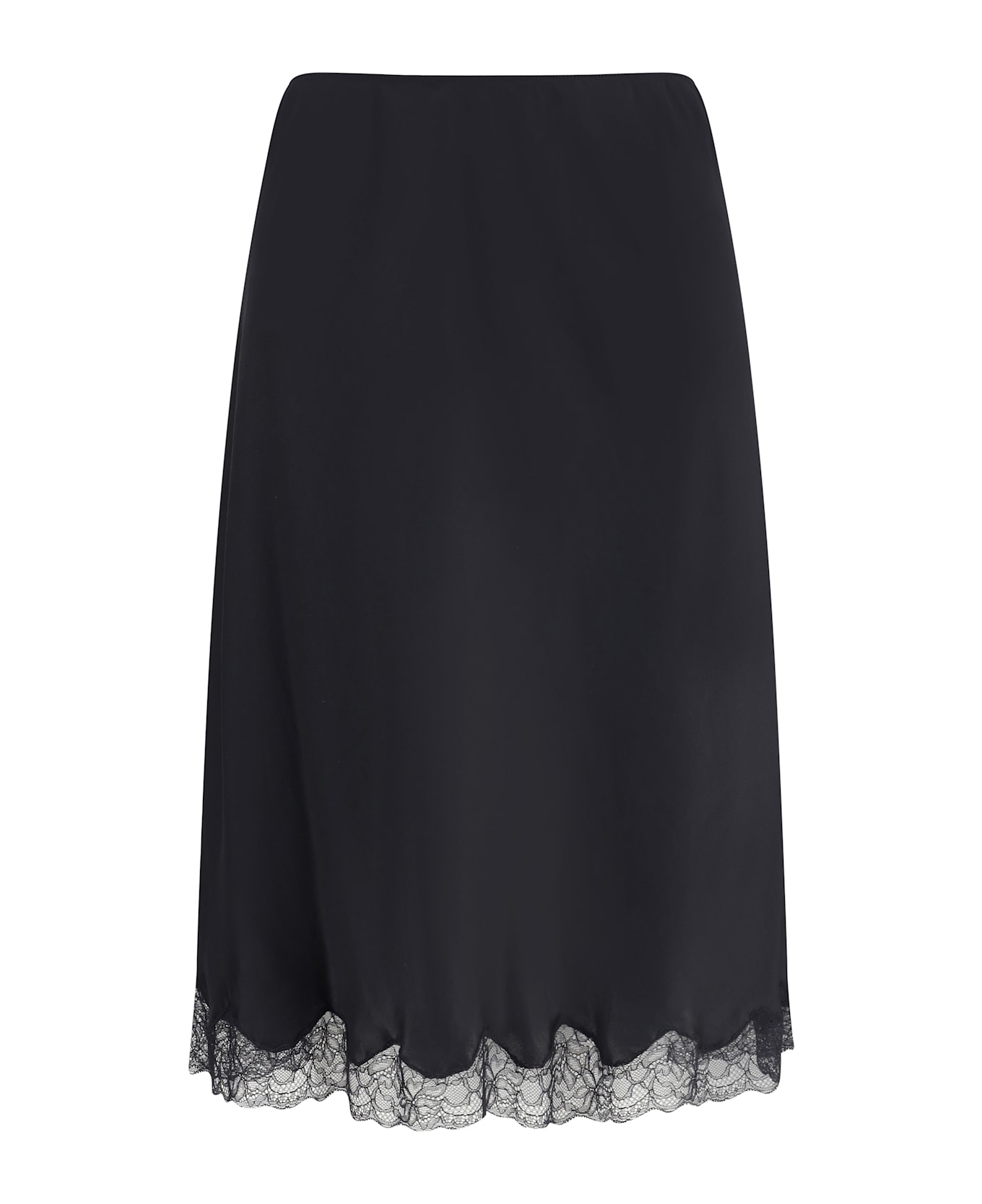 The row's irene midi skirt by the row exemplifies understated and refined elegance. made of fine silk charmeuse, it glides gently over the silhouette giving a fluid and sophisticated fit. the elasticized waist offers comfort without sacrificing style, while the tone-on-tone lace trim adds a feminine and refined detail, perfectly in line with the brand's essential and luxurious aesthetic.