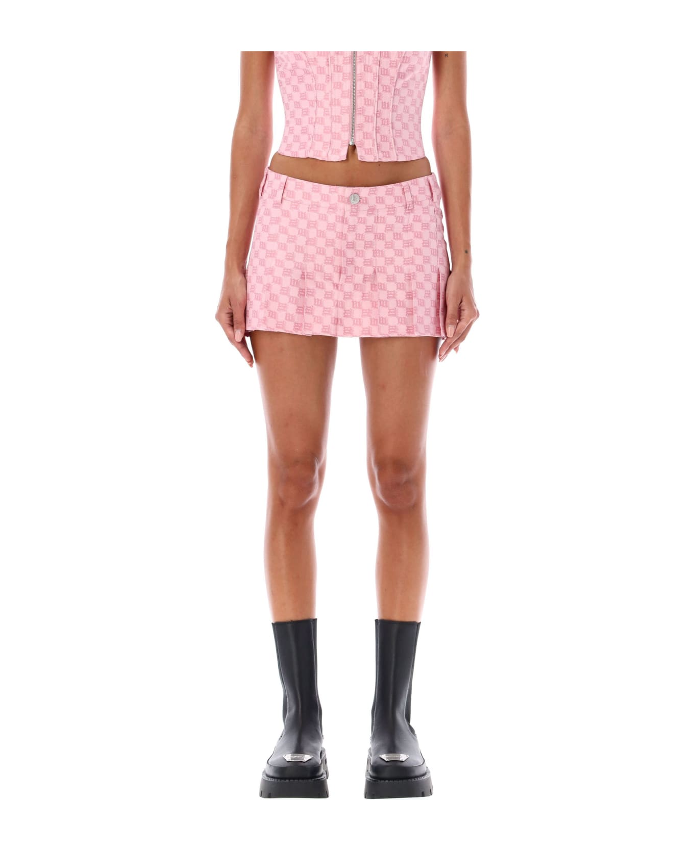 Jacquard Canvas Monogram School Mini Skirt By Misbhv. Featuring: Short Mini Skirt Made From Jacquard Fabric All-over Monogram Print Brushed Metal Zip And Button With Logo Closure Pleated Skirt Model Is 1,72 M Tall And He Is Wearing Size S