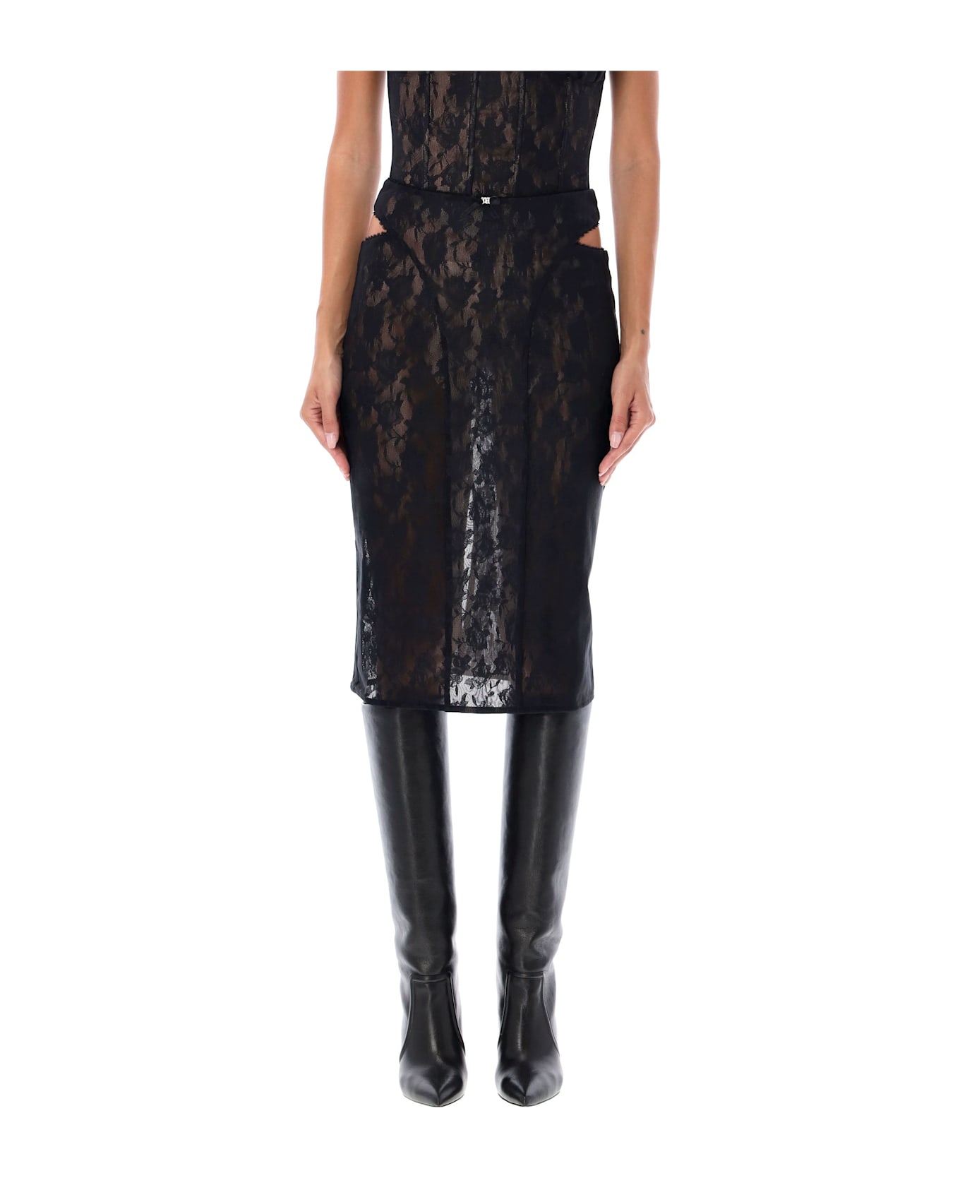 Lace Cut-out Midi Skirt By Misbhv. Featuring: Floral Lace Cut-outs At Sides Metal Logo At Front Back Zip Closure Back Slit Nude Lining Model Is 1,72 M And Wears Size S