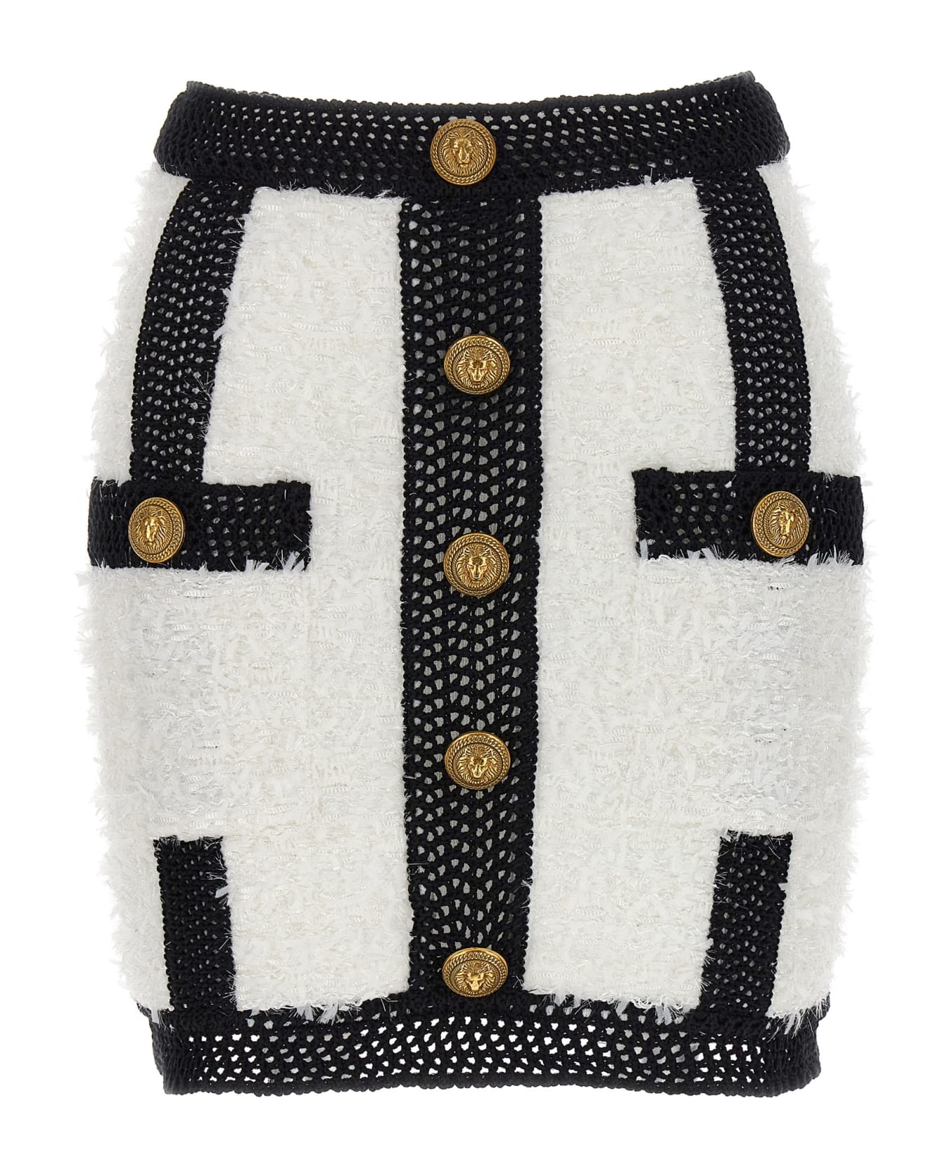 Tweed skirt with gold metal buttons bearing the logo on the front, contrasting crochet fabric inserts, and back zipper closure. Composition: 33% pa, 32% vi, 27% pl, 8% co