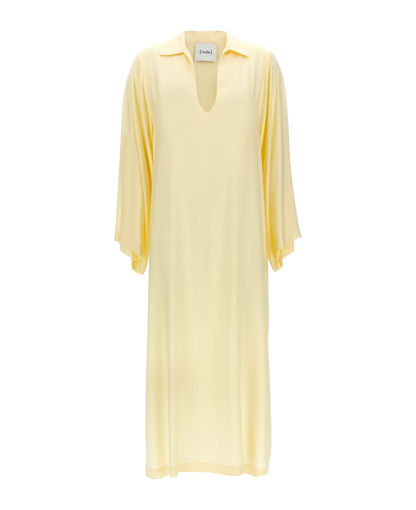 Long viscose dress, V-neck, slightly wide long sleeves, shirt collar, side slits.