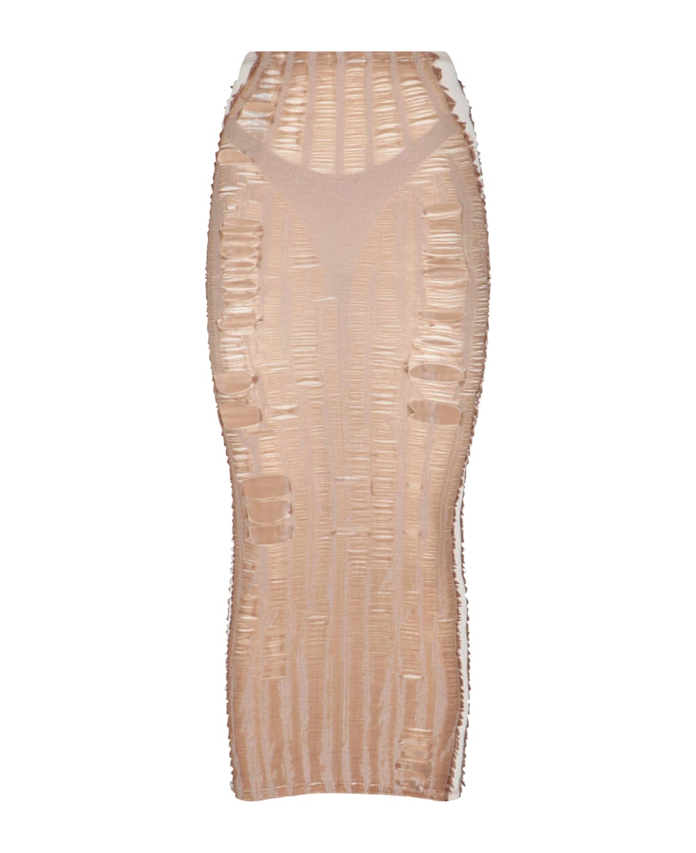 Diesel "M-Calina" maxi skirt in beige cotton blend with all-over destroyed details, ribbed pattern, trompe-l' il lingerie front and back, straight hem. Composition: 65% Cotton, 35% Polypropylene