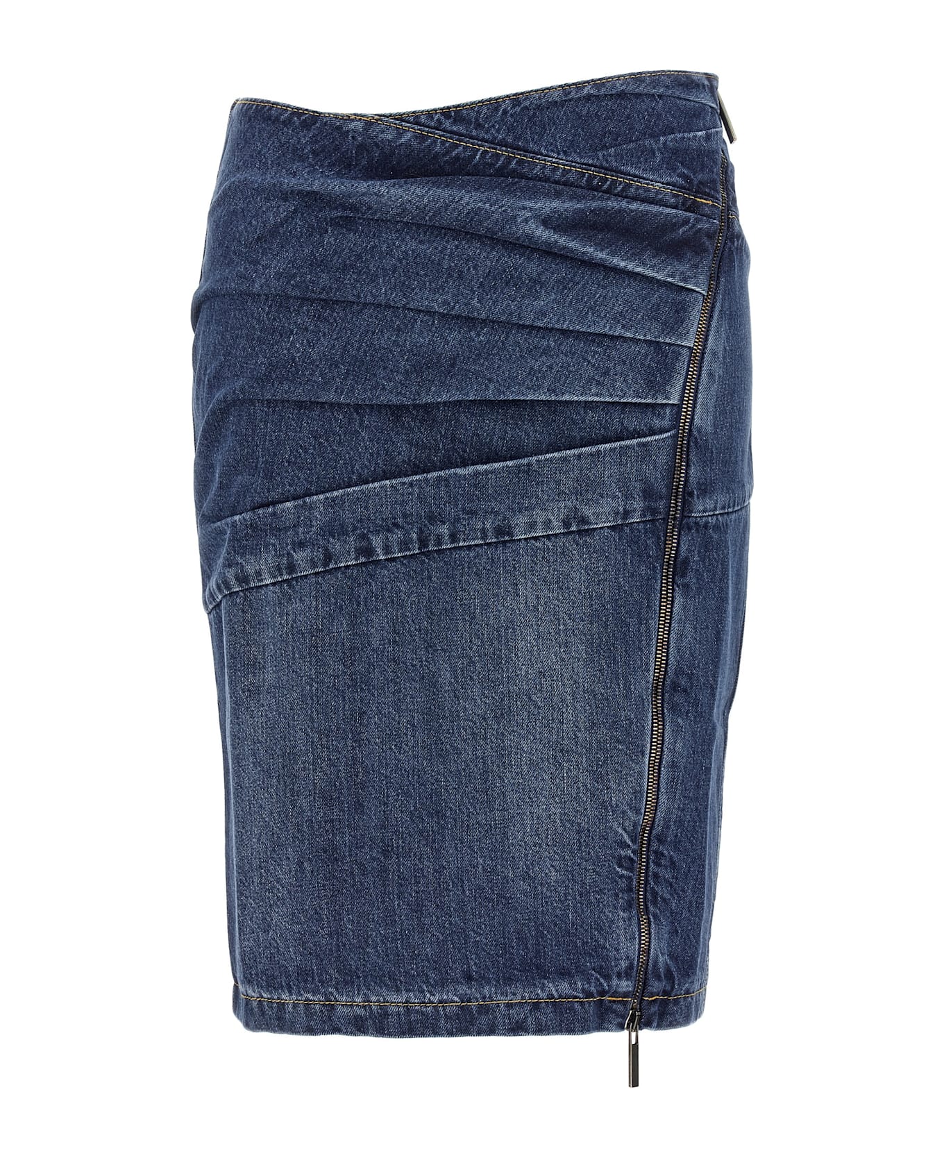 Midi skirt in cotton denim with asymmetrical side zip closure, front stitched pleats, pences at the waist.