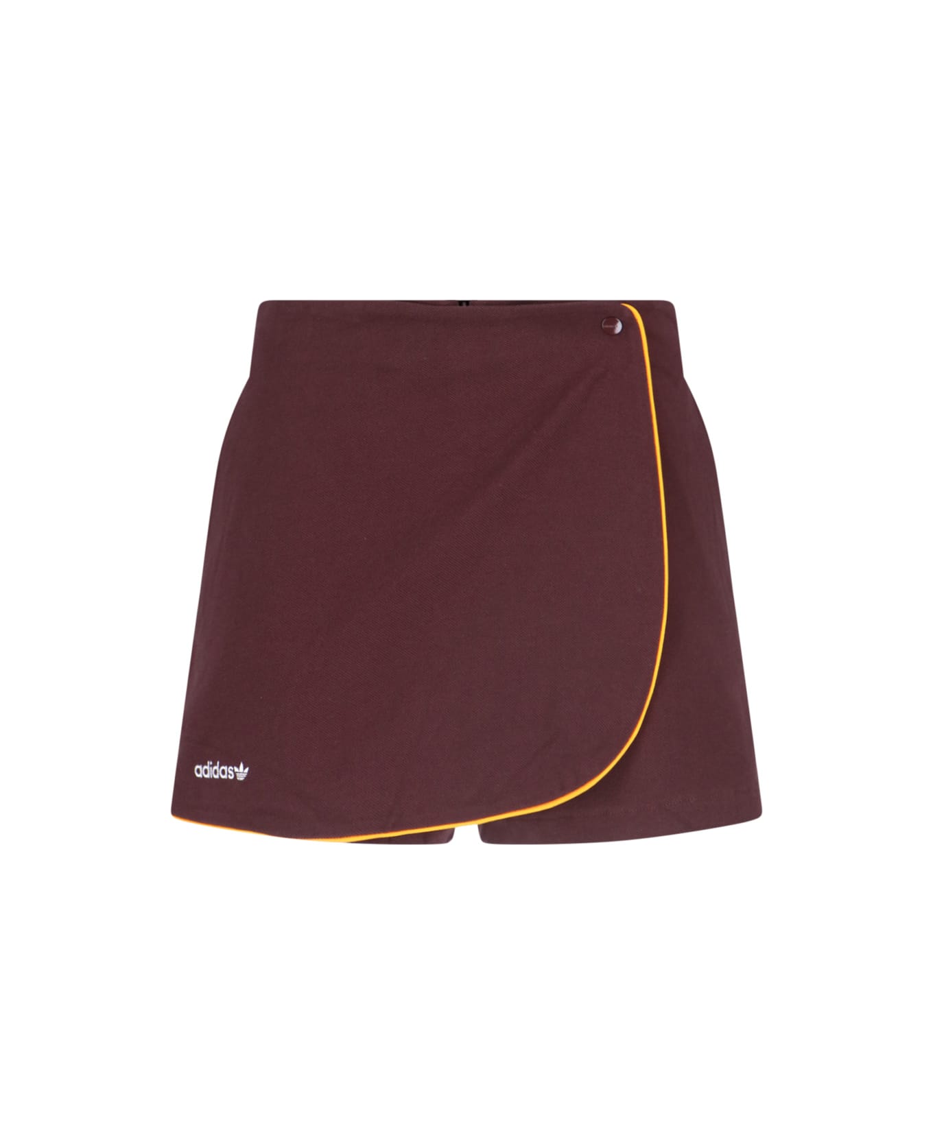 Adidas 80's mini skirt in brown cotton with medium elastic waistband, detachable panel on the front with logo detail, contrasting orange trim, back zip closure, uneven hem.