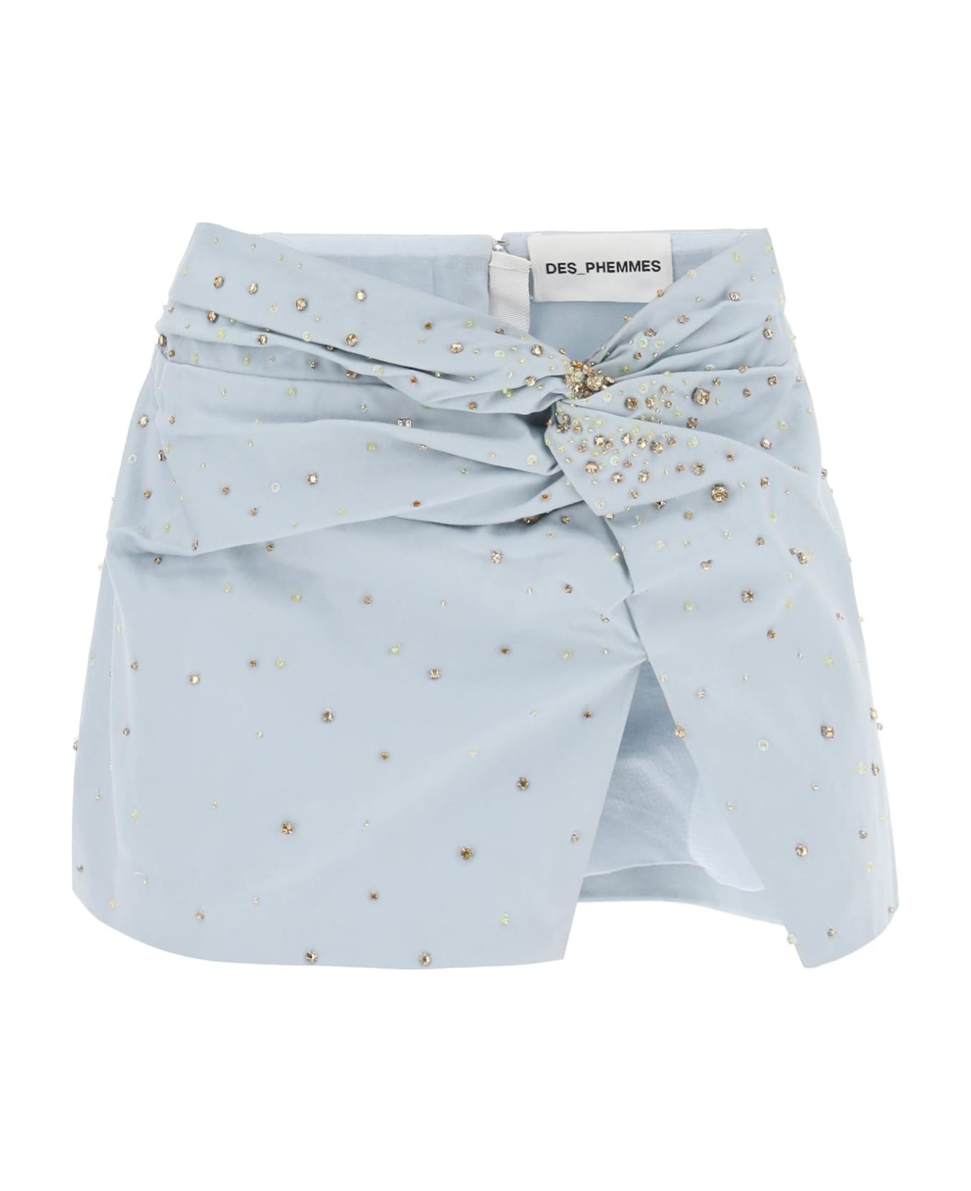 DES PHEMMES low-rise mini skirt in stretch cotton, adorned with crystals and sequins. A draped front detail and a split hem complete the look. Back invisible zip closure, lined interior. The model is 177 cm tall and wears a size IT 40.