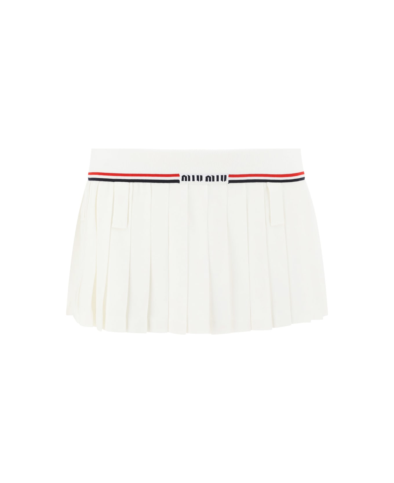 Mini skirt by miu miu, all-over pleated pattern, contrasting embroidered waistband, iconic brand signature embroidered on front, elasticated waistband. Composition: 98% % Viscose, 2% % Elastane