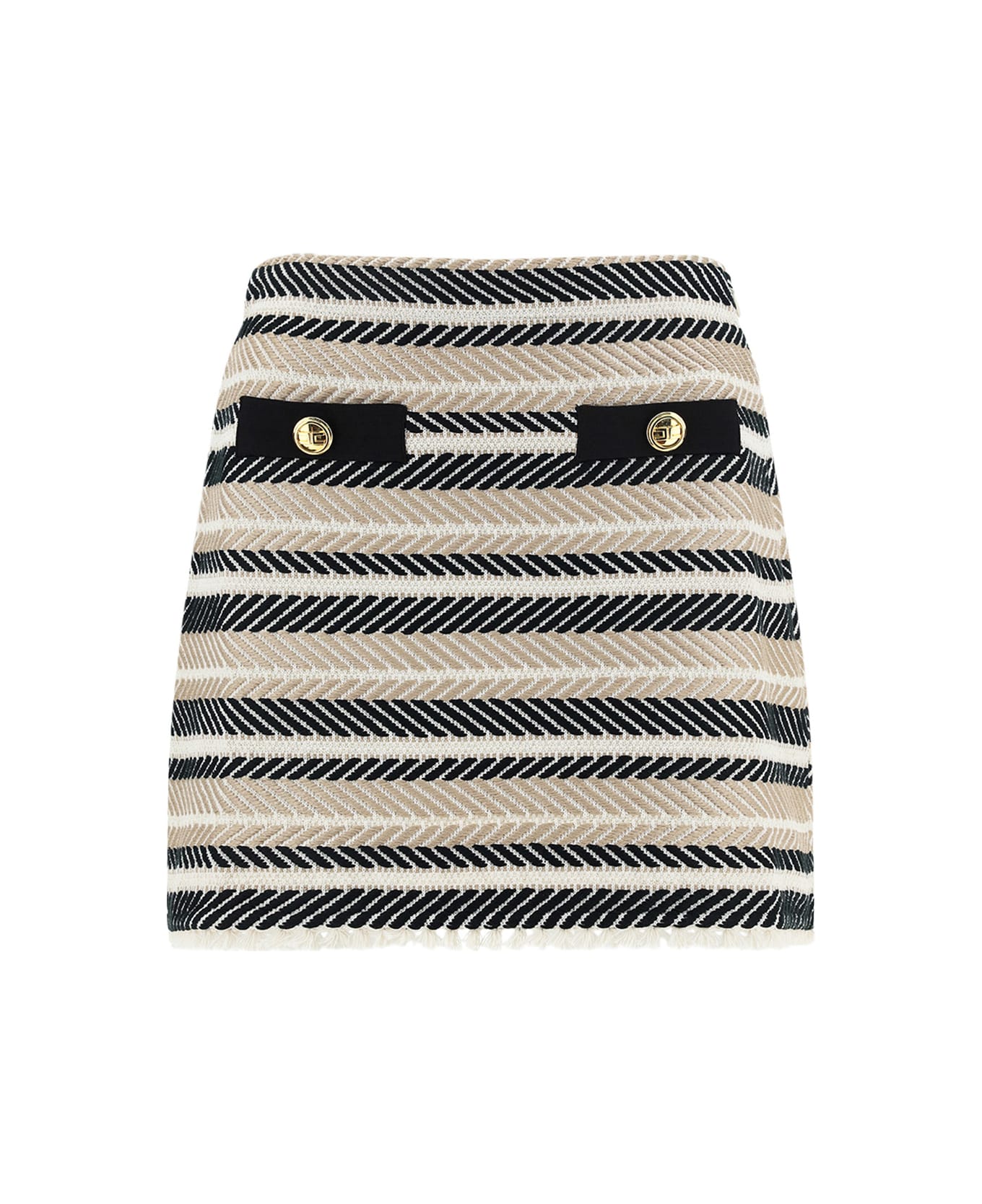 Mini skirt by elisabetta franchi, knitted weave design, contrasting embossed button on front, multicolored horizontal band pattern, frayed hem. Composition: 28% % Cotton, 68% % Acrylic, 1% % Polyester, 1% % Polyamide, 2% % Viscose