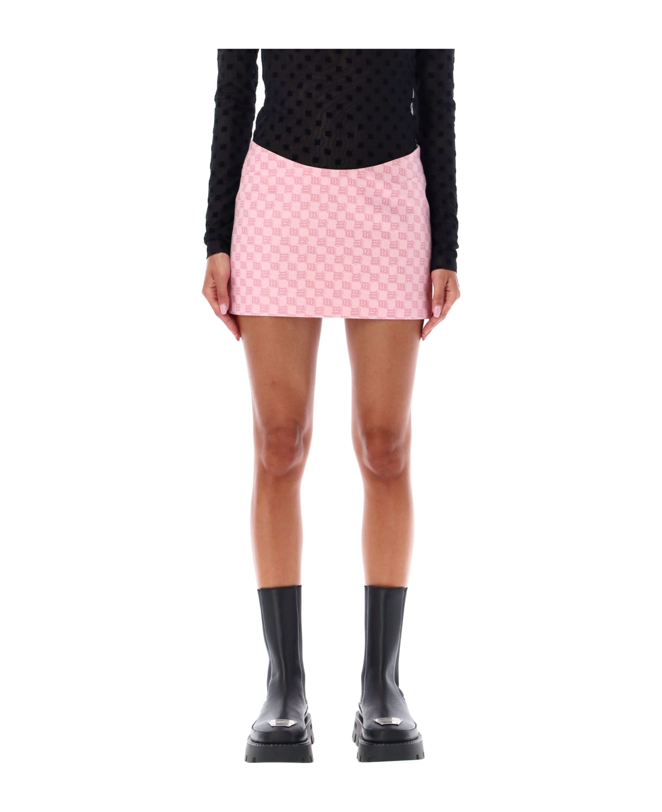 Monogram Mini Skirt By Misbhv. Featuring: Short, Fitted Skirt In Crafted From Stretchy Fabric Allover Monogram "m" Pattern Elastic Lining Back Zip Fastening Model Is 1,72 M Tall And She Is Wearing Size S